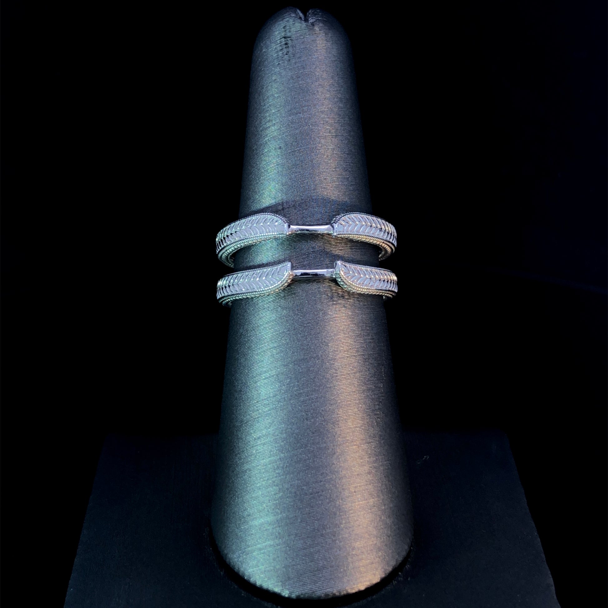 This beautiful ring guard is crafted with exquisite detail in 14kt white gold. Its intricate etching and timeless beauty will make an unforgettable statement of elegance. Indulge in the sophistication of a ring guard that stands the test of time. This ring is a size 7. If that size is not the perfect fit, first time sizing is free at the time of purchase. Additional sizing fees may apply.