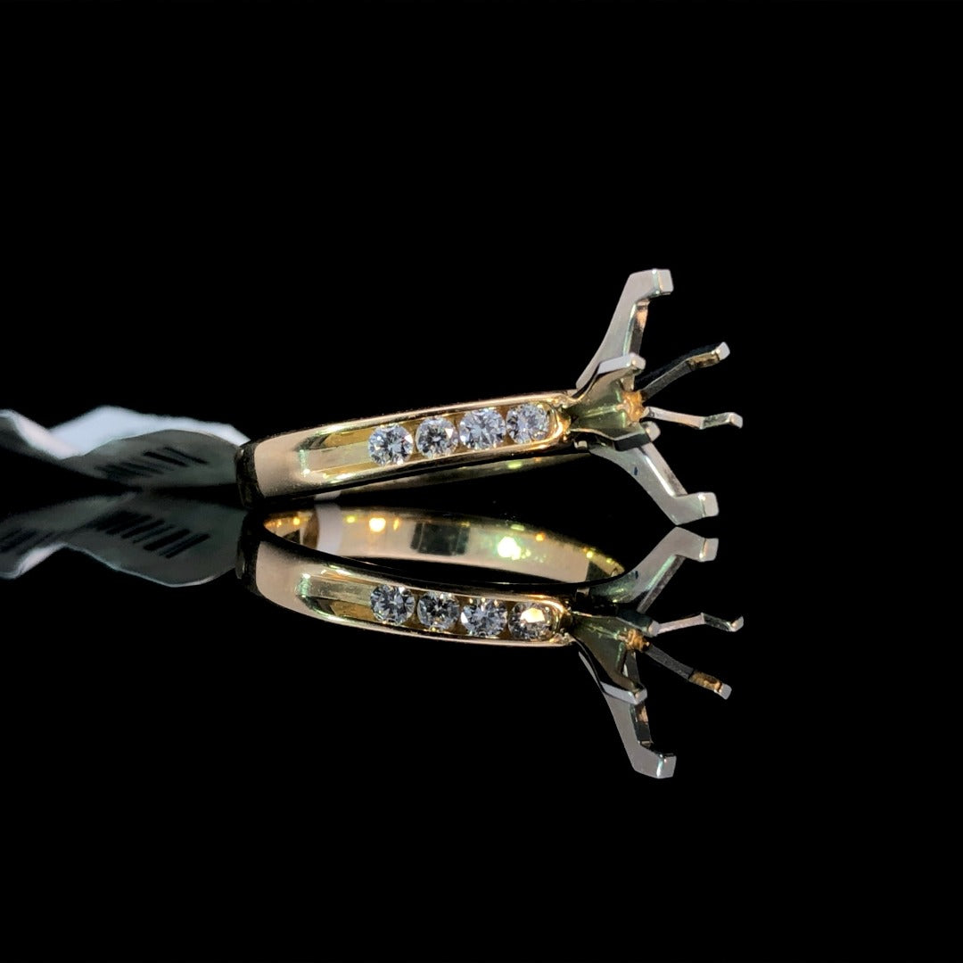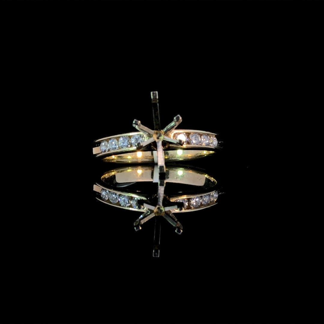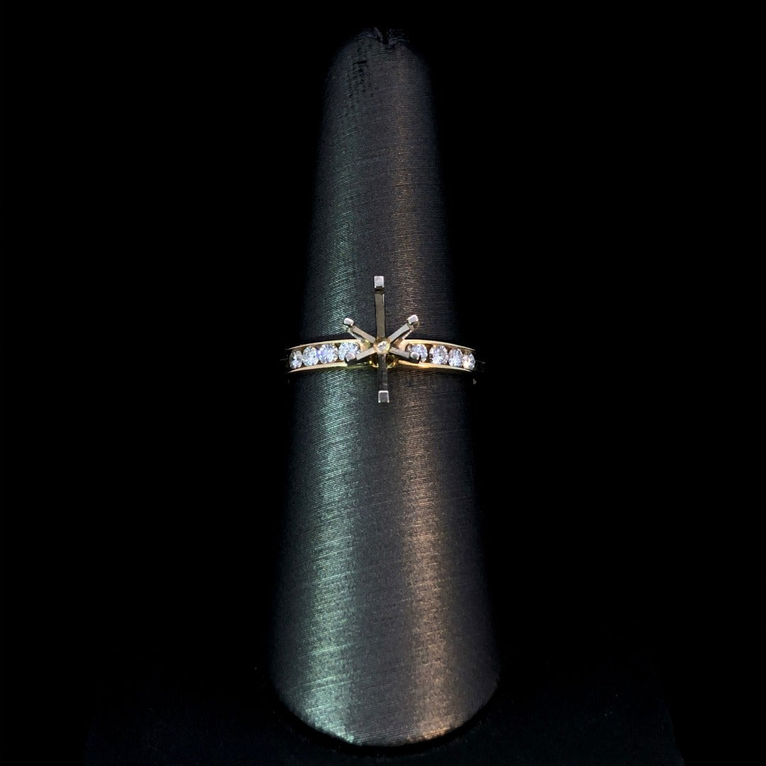 Elevate your look with our timeless diamond semi mount. The 14kt yellow gold channel set band boasts .26ctw of round diamonds, adding a touch of luxury. Personalize your piece by selecting a center stone from our exquisite collection. Your perfect accessory awaits. This ring is a size 7. If that size is not a perfect fit, first time sizing is free at the time of purchase. Additional sizing fees may apply.