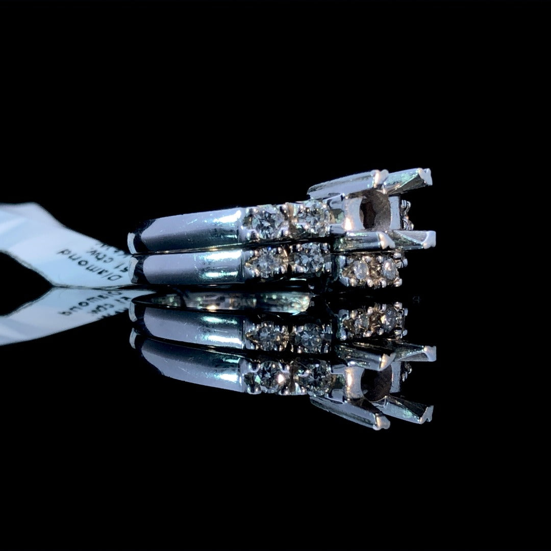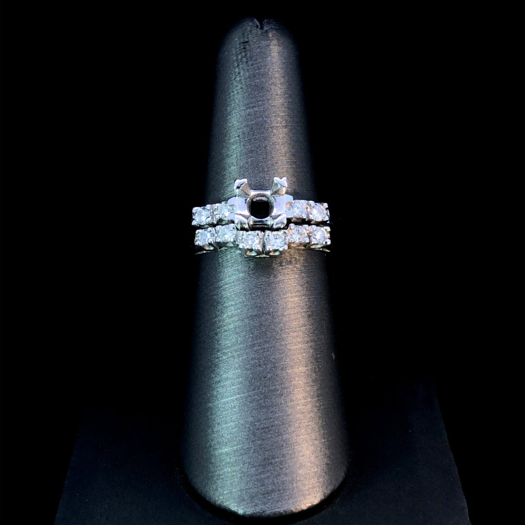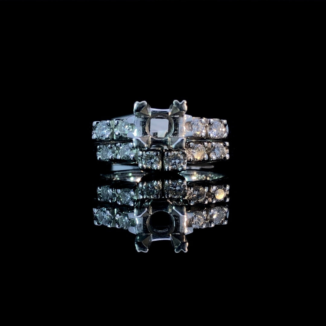 Elevate your special day with our exquisite bridal set. Featuring a 14kt white gold semi mount and contour band adorned with .51ctw of brilliant round diamonds, this set exudes timeless elegance. Complete the look with your chosen center stone from our collection of loose diamonds and gemstones for a personalized touch. Price is for the semi mount only. Center stone will be added at an additional cost. This ring is a size 6.5. If that size is not a perfect fit, firs time sizing is free at the time of purchase. Additional sizing fees may apply.