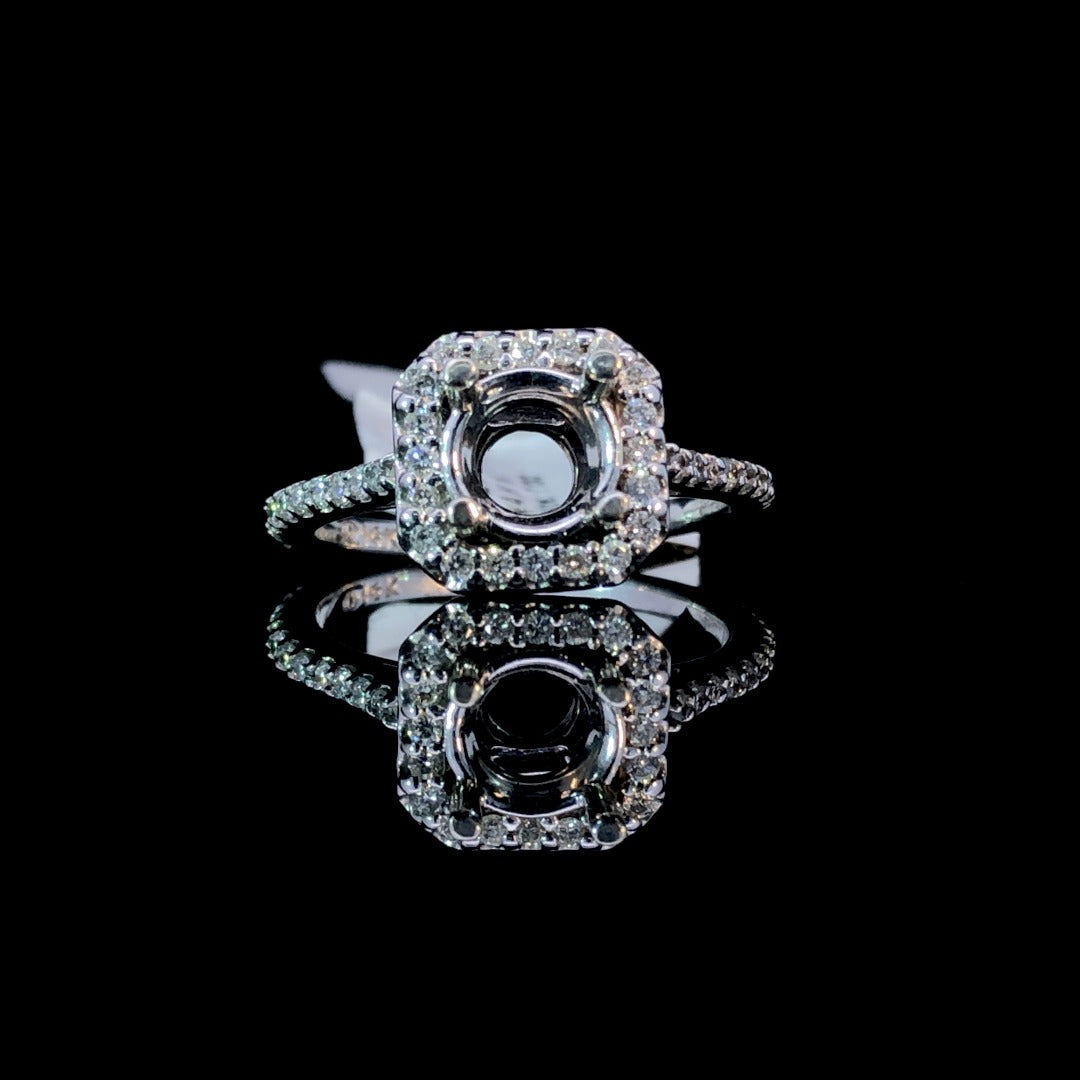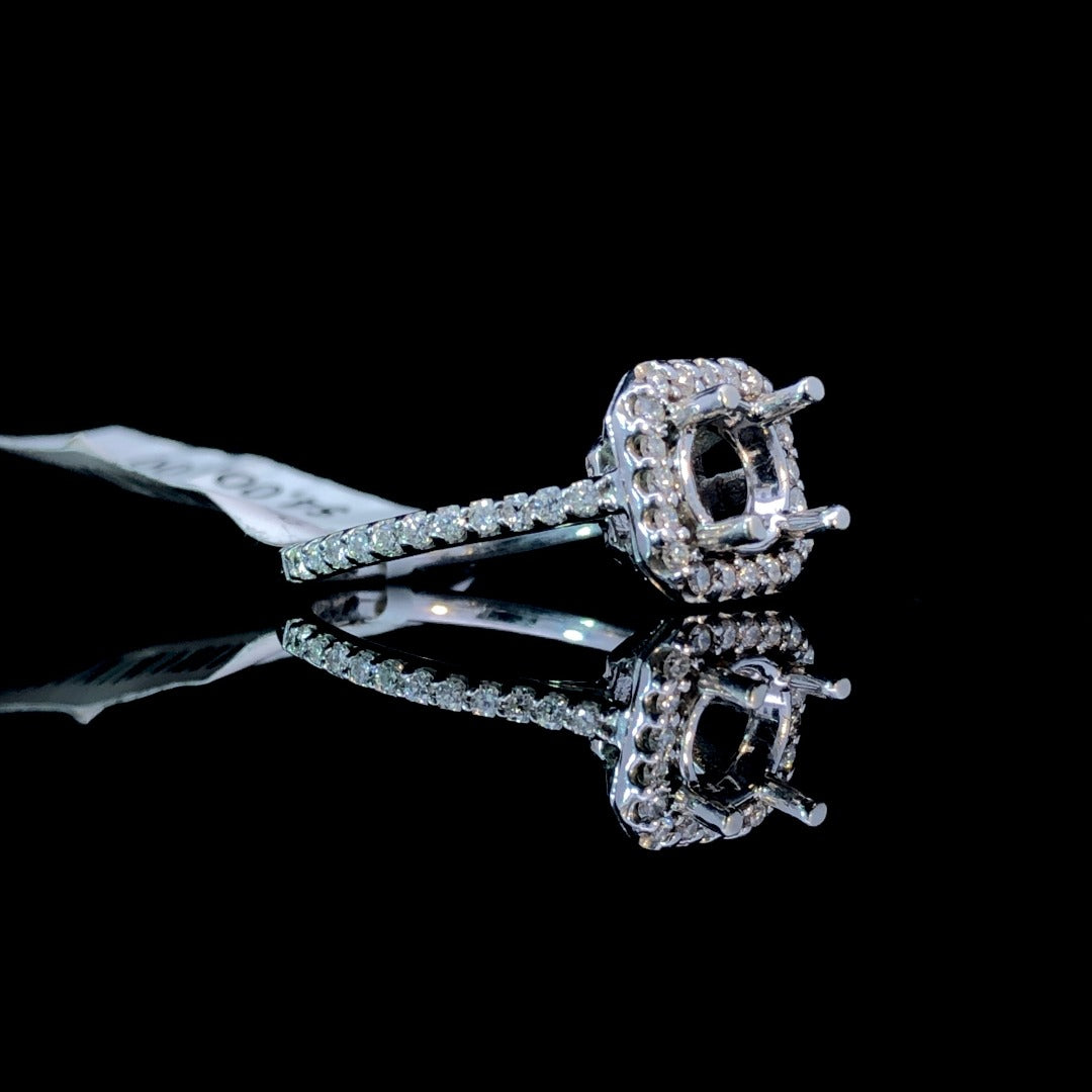 Elevate your style with our gorgeous semi mount, featuring a timeless halo design adorned with .42ctw round diamonds. Crafted in 14kt white gold, this luxurious piece allows you to personalize it with your choice of center stone. Choose from our extensive collection of loose stones to complete this stunning, one-of-a-kind ring. Price is for the semi mount only. Center stone will be added at an additional cost. This ring is a size 7. If that size is not a perfect fit, first time sizing is free at the time of purchase. Additional sizing fees may apply.