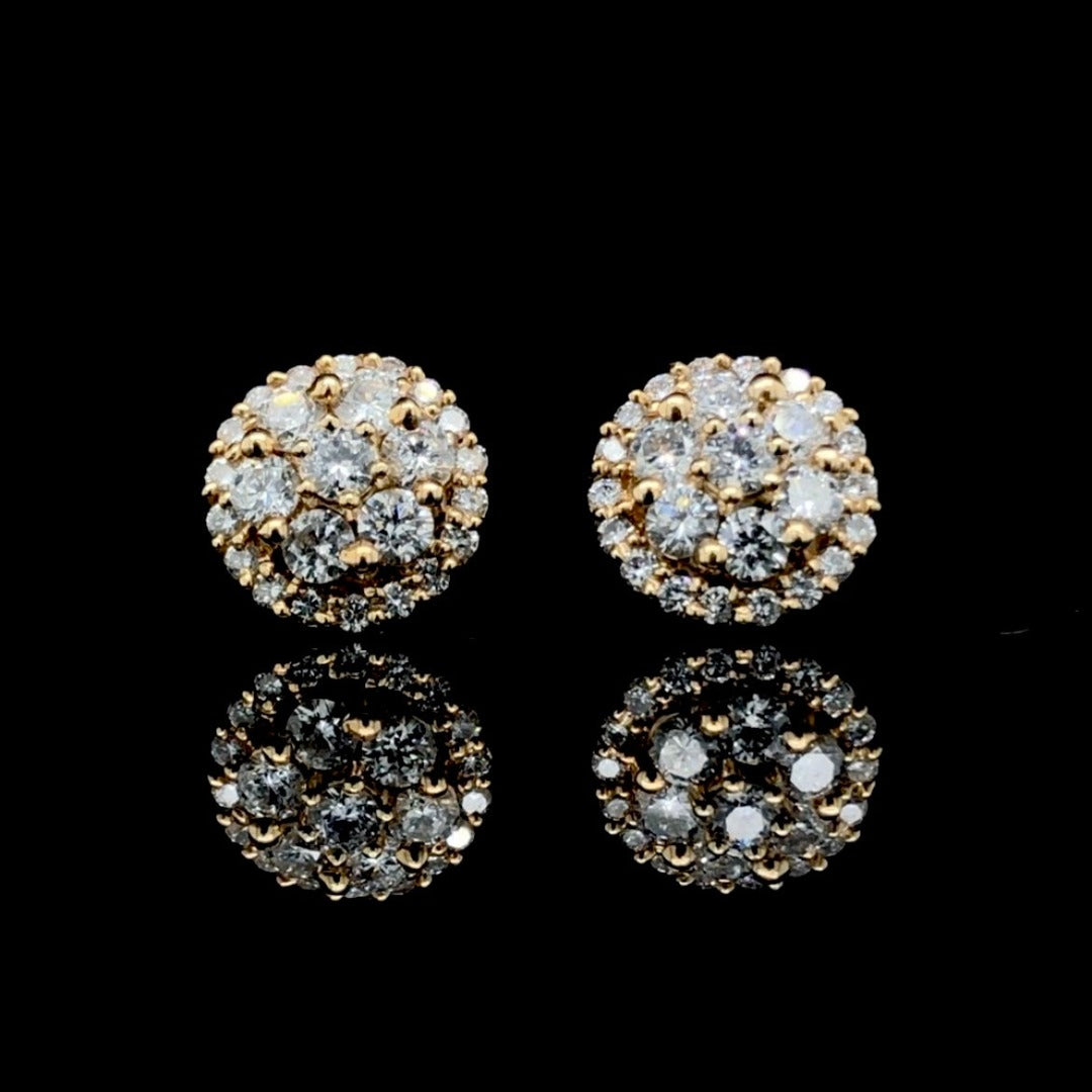 These 14 kt yellow gold earrings feature an impressive 1.00 ctw of round diamonds in a sophisticated cluster design, adding a sparkling touch to any outfit. An ideal choice for special occasions, these glamorous earrings are sure to turn heads and make a stunning impression.