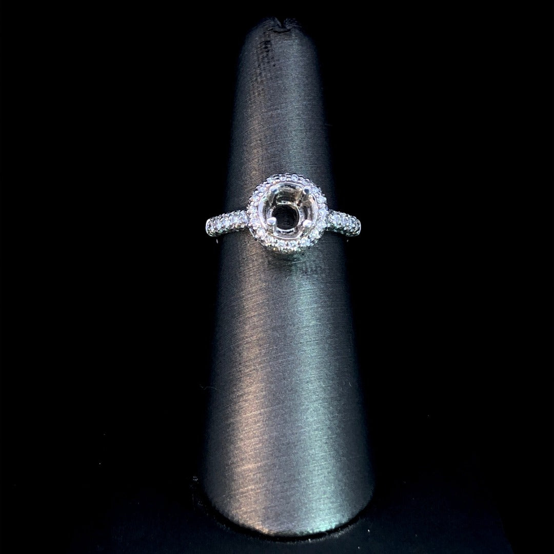 Enhance your beauty with this exquisite 14kt white gold semi mount featuring an extended halo and .28ctw of round, pave set diamonds. Customize your look with a round center stone from our loose stone collection. Experience timeless elegance and long-lasting shine. Price is for the semi mount only. Center stone will be added at an additional cost. This ring is a size 6. If that size is not a perfect fit, first time sizing is free at the time of purchase. Additional sizing fees may apply.