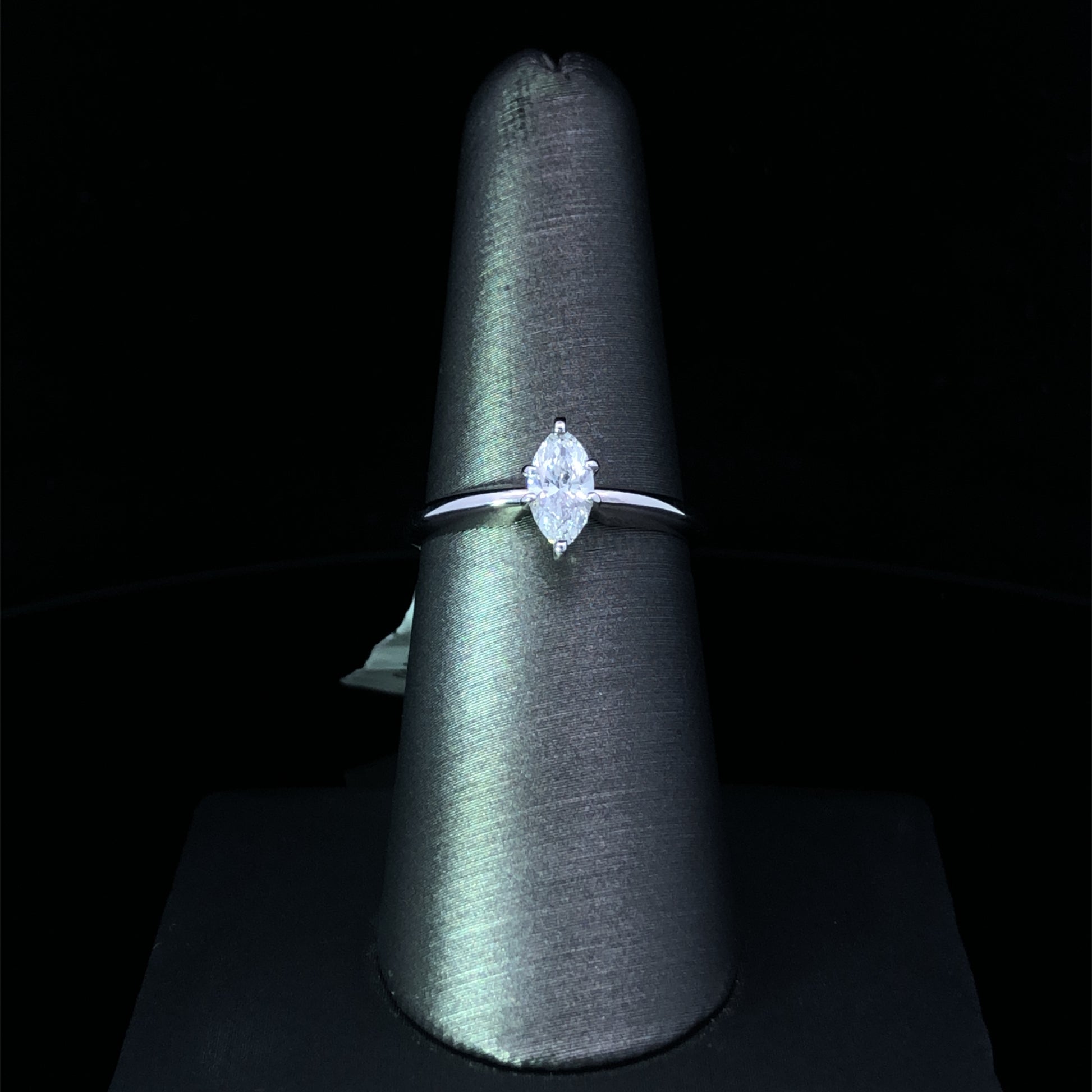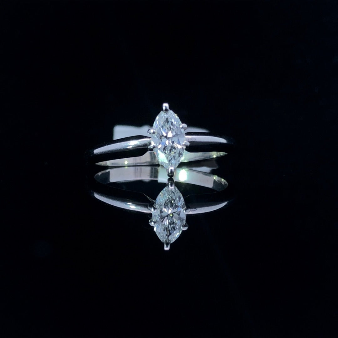 This 14kt white gold solitaire ring is the perfect display of timeless elegance. The .52ct marquise diamond sparkles with a captivating allure, enhancing its luxurious look and feel. With an exclusive design and refined craftsmanship, this exquisite piece is a timeless symbol of classic beauty. This ring is a size 7. If that size is not a perfect fit, first time sizing is free at the time of purchase. Additional sizing fees may apply.