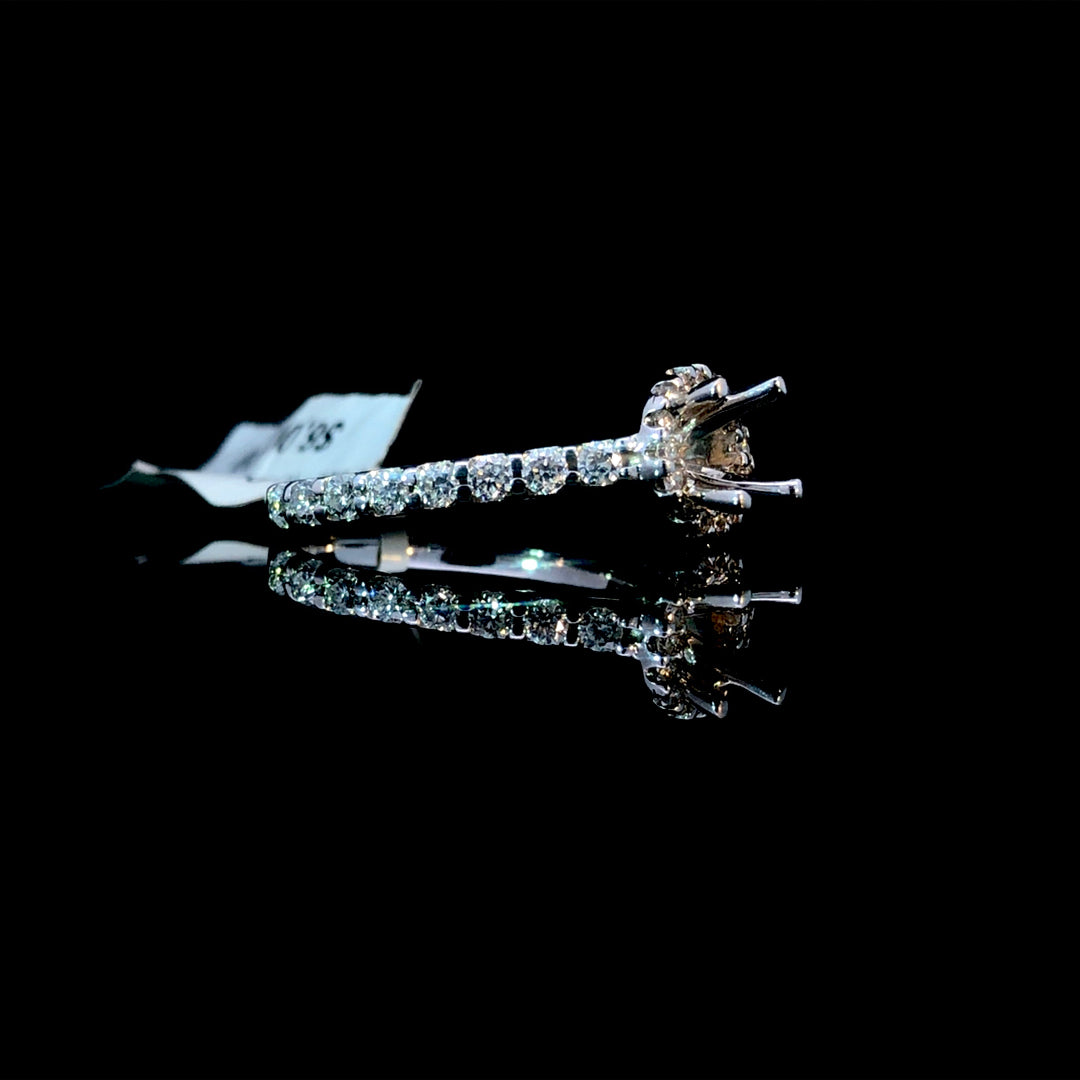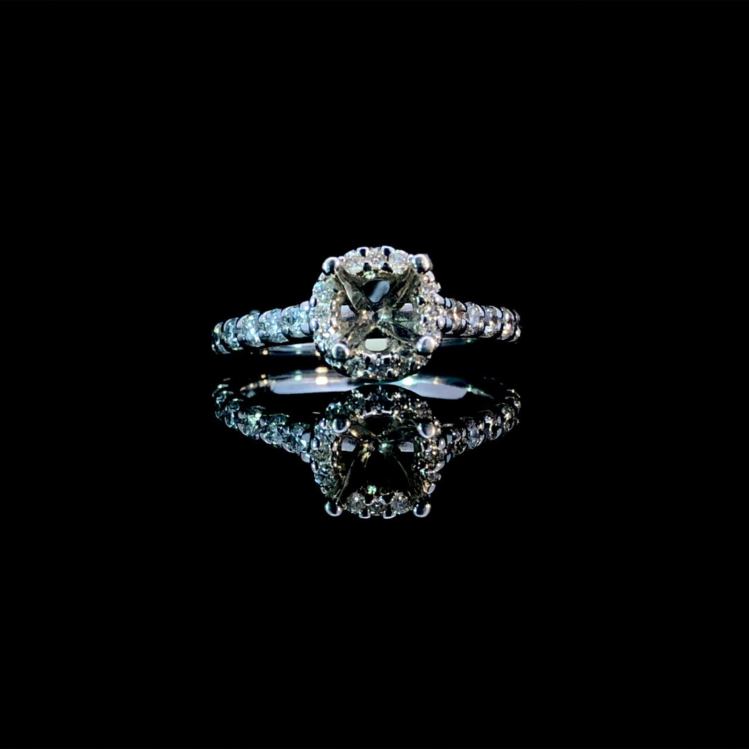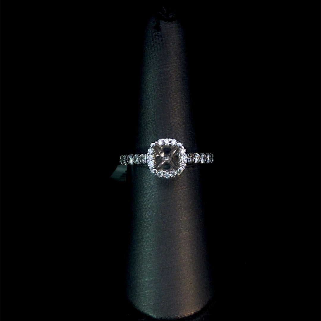 This timeless diamond semi mount combines a round halo with diamonds along the band, offering a total carat weight of 0.80 ctw in 14kt white gold. Customize your ring by selecting a center stone from our extensive collection of loose stones, creating a piece that is uniquely yours and truly special. Price is for the semi mount only. Center stone will be added at an additional cost. This ring is a size 7. If that size is not a perfect fit, first time sizing is free at the time of purchase. Additional sizing fees may apply.