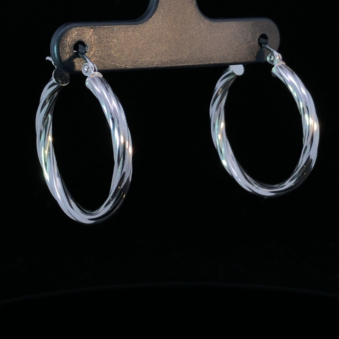 These 14kt white gold hoop earrings are a timeless accessory, featuring a unique twisted design. Perfect for any occasion, the lightweight and durable design ensures the earrings are comfortable to wear all day long.