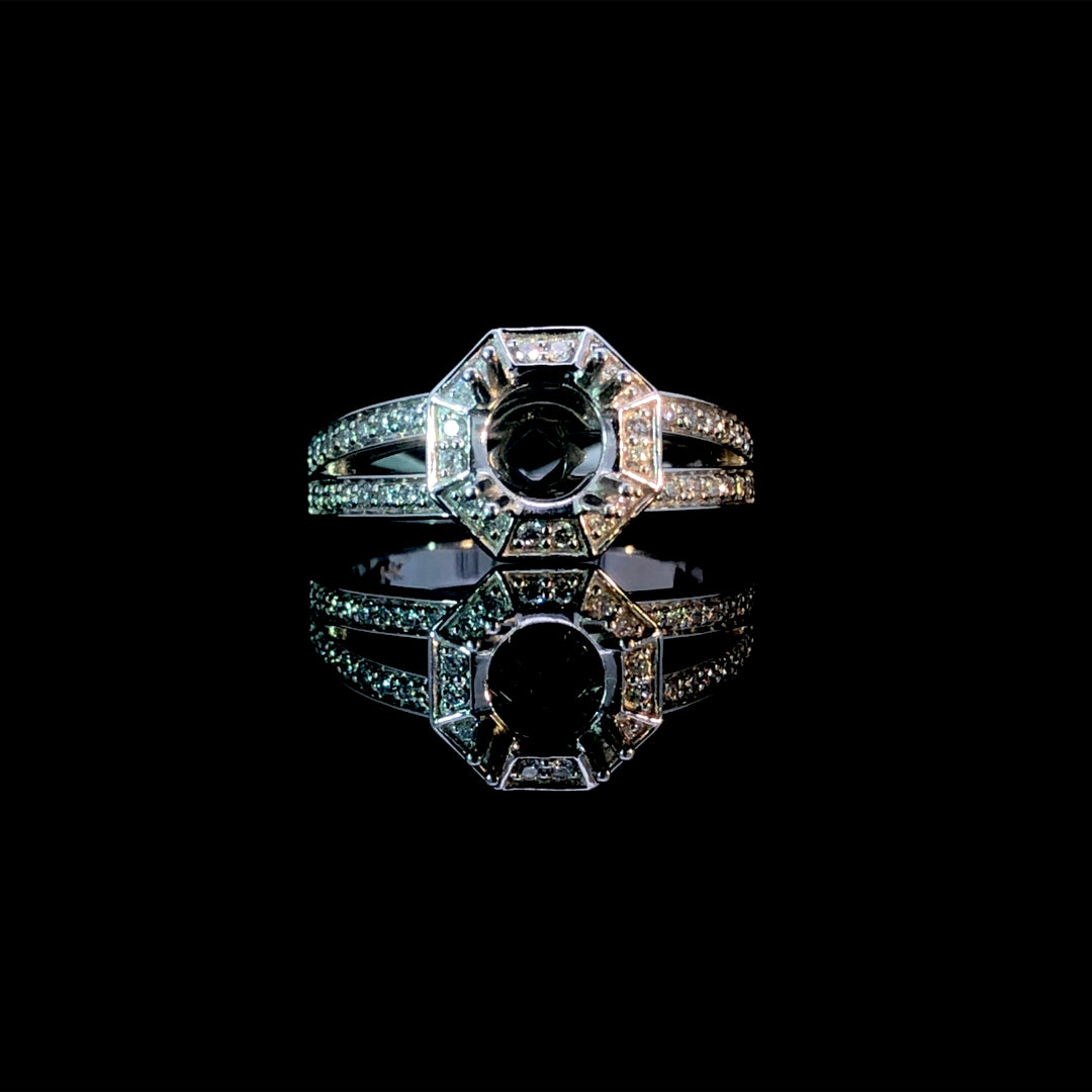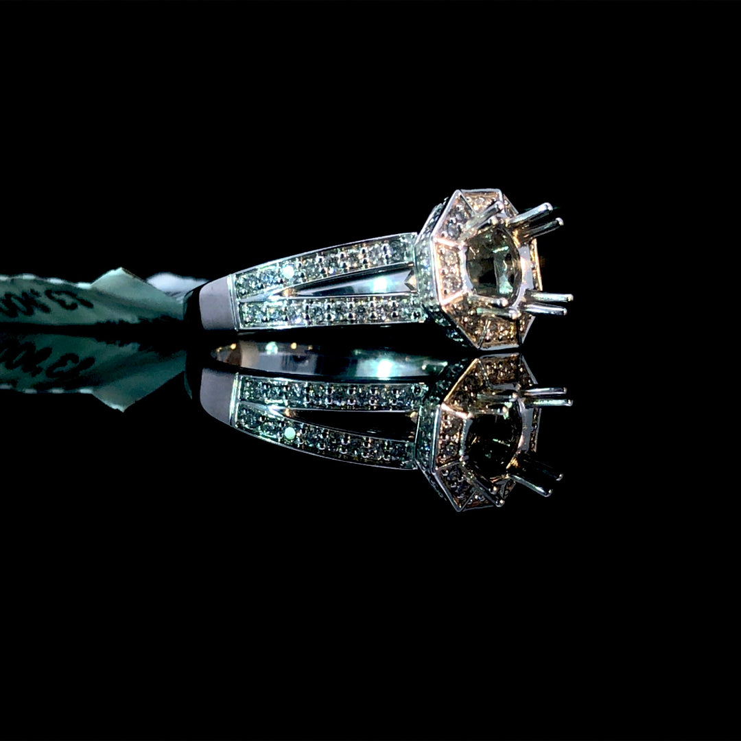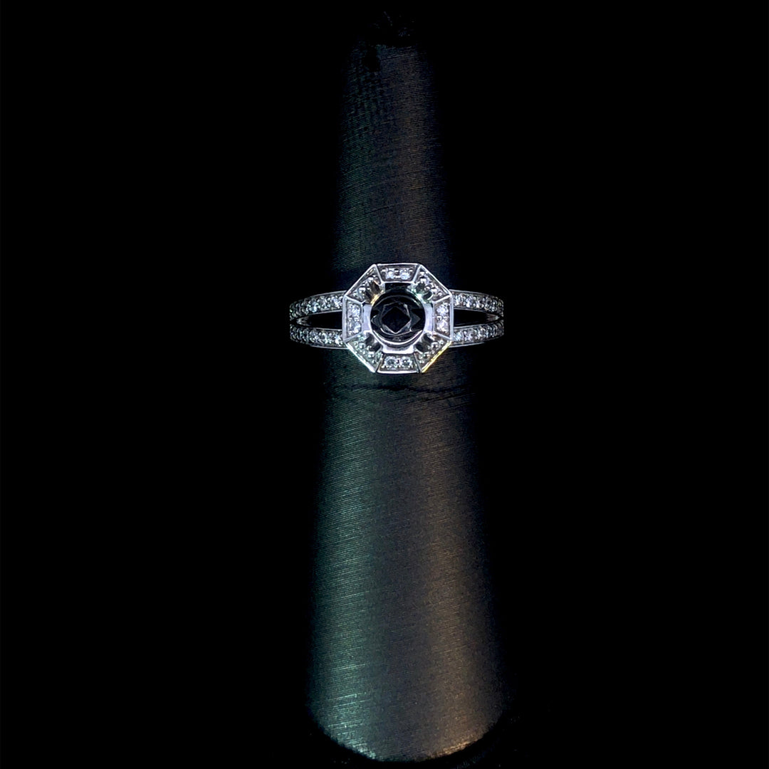 Turn heads with this unique semi mount featuring an octagonal halo and split shank adorned with 0.38 ctw of round diamonds set in 14kt white gold. Make it truly your own by choosing a center stone from our unmatched selection of loose stones to complete this stunning piece. Price is for the semi mount only. Center stone will be added at an additional cost. This ring is a size 6. If that size is not a perfect fit, first time sizing is free at the time of purchase. Additional sizing fees may apply.