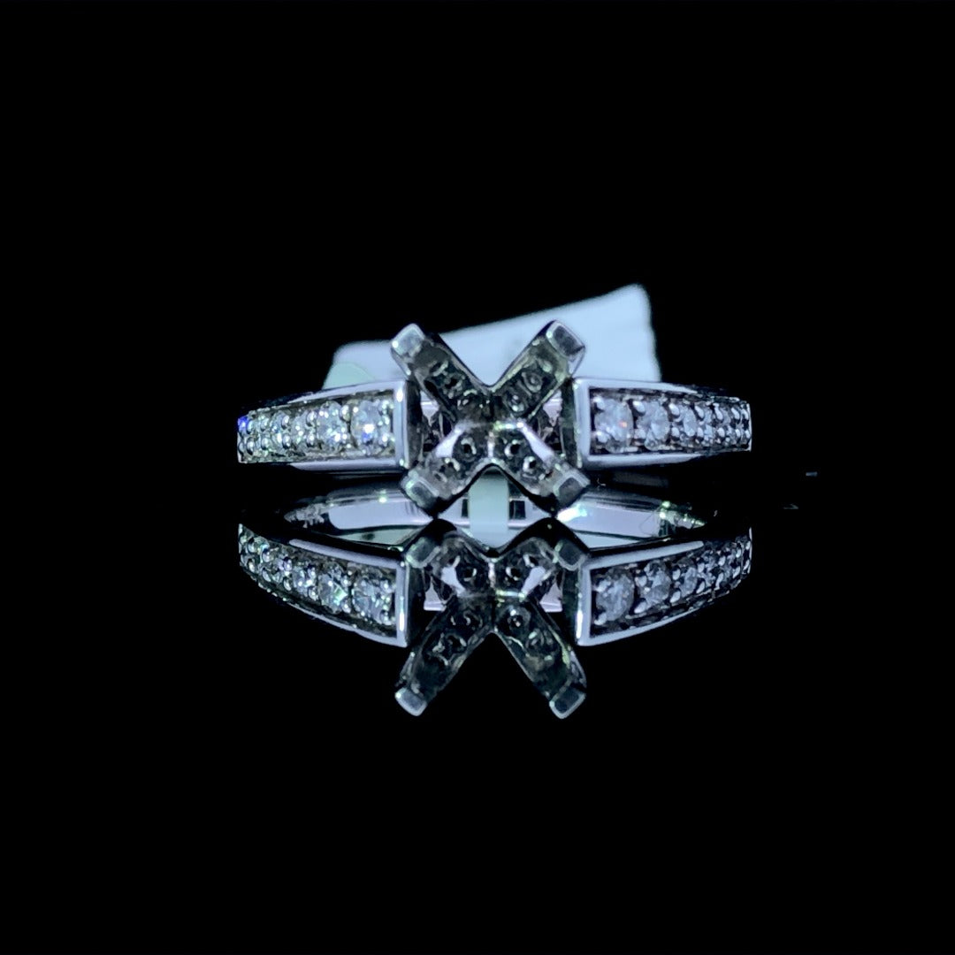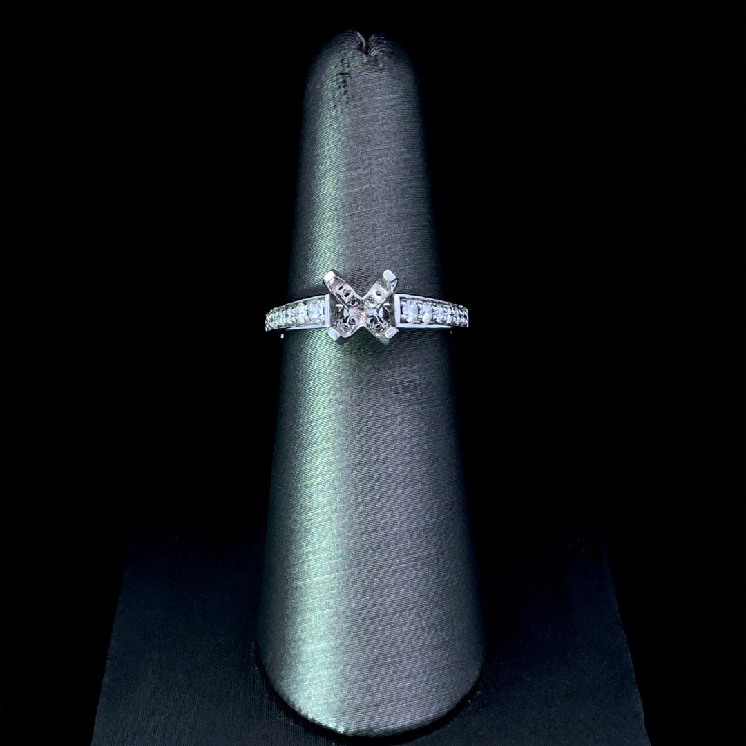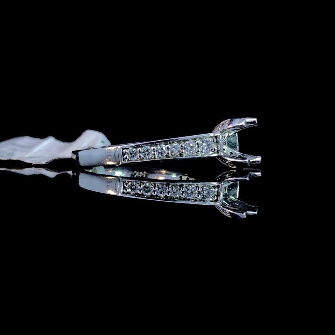 This stunning 14kt white gold diamond semi mount is sure to make a dramatic statement! Boasting .47ctw of diamonds on the cathedral band, on the head, and on the side of the shank, this piece will sparkle from all angles. Elevate your look with the center stone of your choice and create an unforgettable sparkle that will last a lifetime! Price is for the semi mount only. Center stone will be added at an additional cost. This ring is a size 6.0. If that size is not a perfect fit, first time sizing is free at the time of purchase. Additional sizing fees may apply.