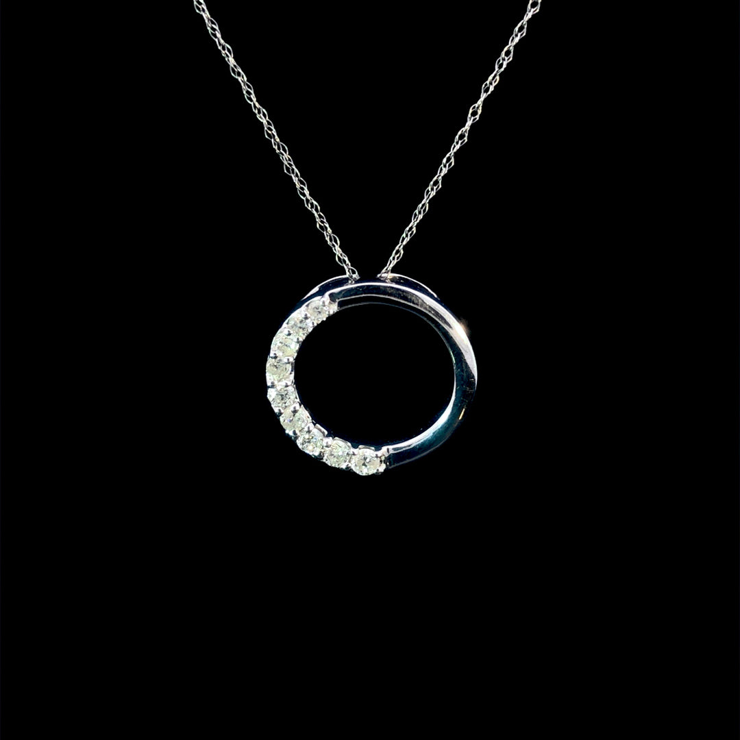 Elevate your everyday style with this diamond circle pendant. Crafted with 14kt white gold and adorned with .50ctw of round diamond accents, this pendant adds effortless elegance to any look. Chain is not included.