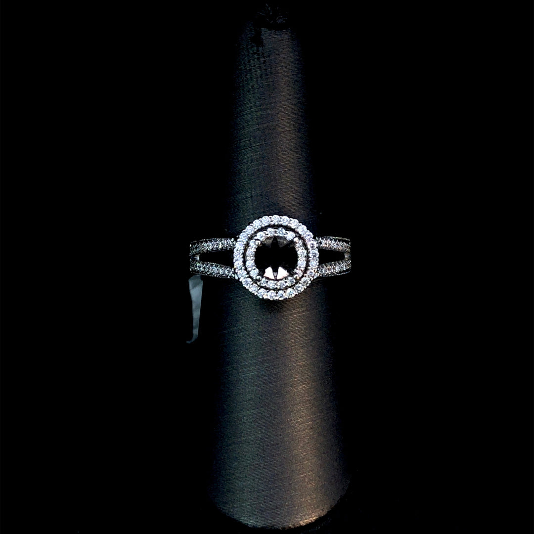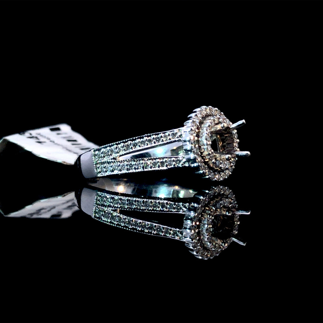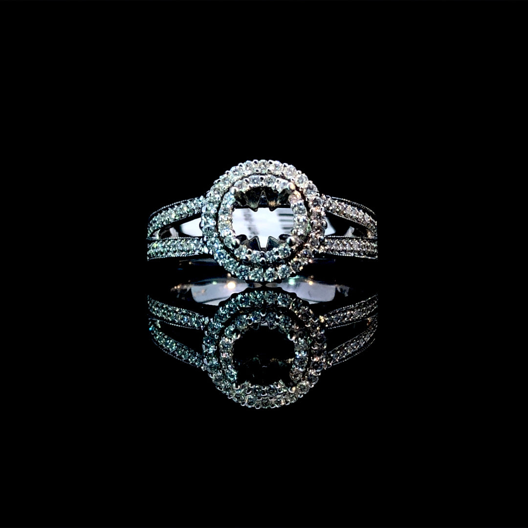 This exquisite 14kt white gold semi mount combines timeless design with modern brilliance, featuring a double round halo and split shank accented with .55ctw of round diamonds. Delicate filigree detailing nestled beneath the head brings an extra dimension of sophistication and charm. We're here to support you in selecting the perfect center stone from our diverse collection, helping you build a ring that's uniquely yours and absolutely radiant. Price is for the semi mount only. Center stone will be added at an additional cost. This ring is a size 7. If that size is not a perfect fit, first time sizing is free at the time of purchase. Additional sizing fees may apply.