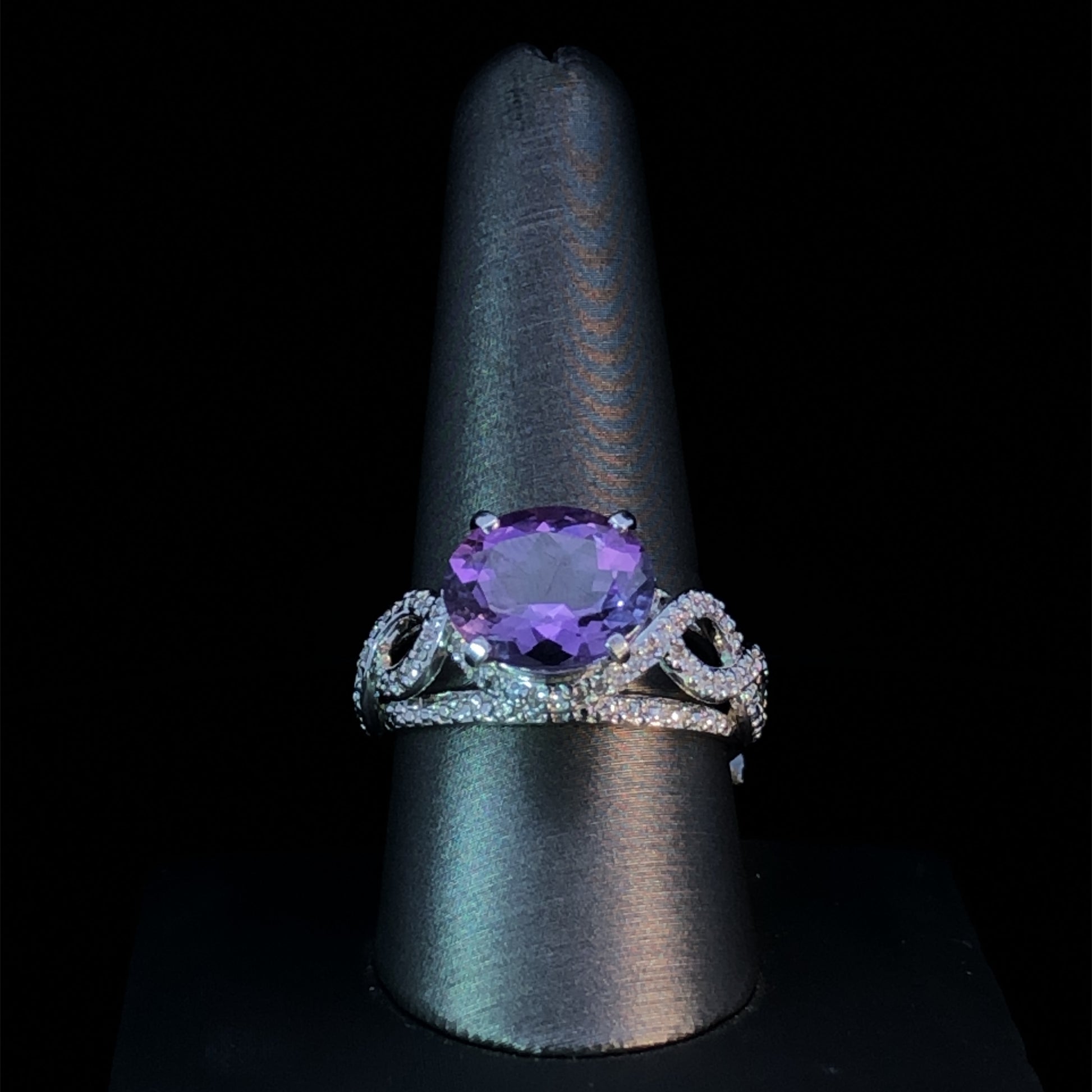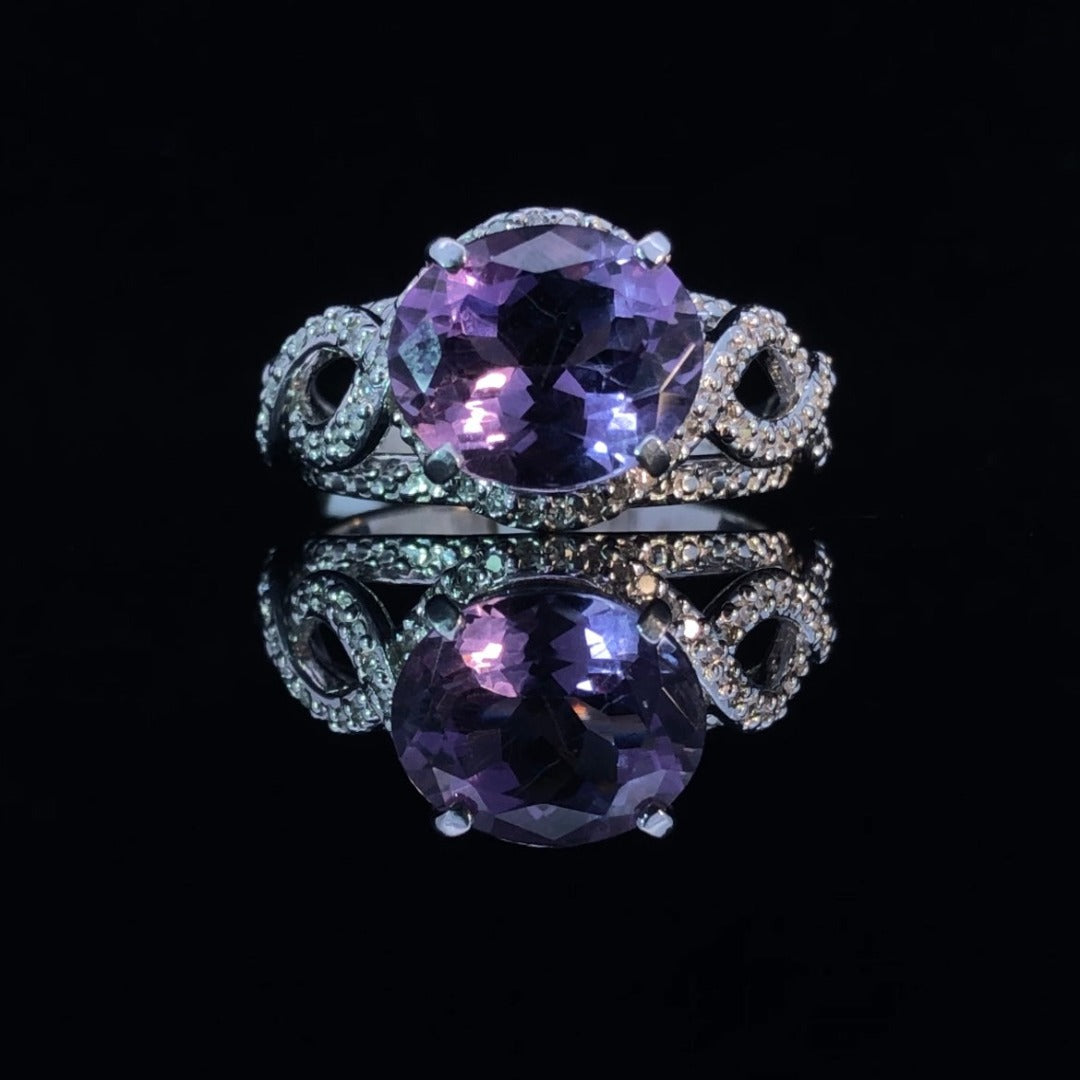 This exquisite gemstone ring, crafted from 14 kt white gold, is a masterpiece of elegance and luxury. The oval amethyst sits at the center, framed in a luxurious twist-style band, and accented with .28 ctw of brilliant round diamonds for an unforgettable gleam. Adorn yourself with this timeless beauty for a look of refinement that stands out from the crowd. This ring is a size 10. If that size is not a perfect fit, first time sizing is free at the time of purchase. Additional sizing fees may apply.