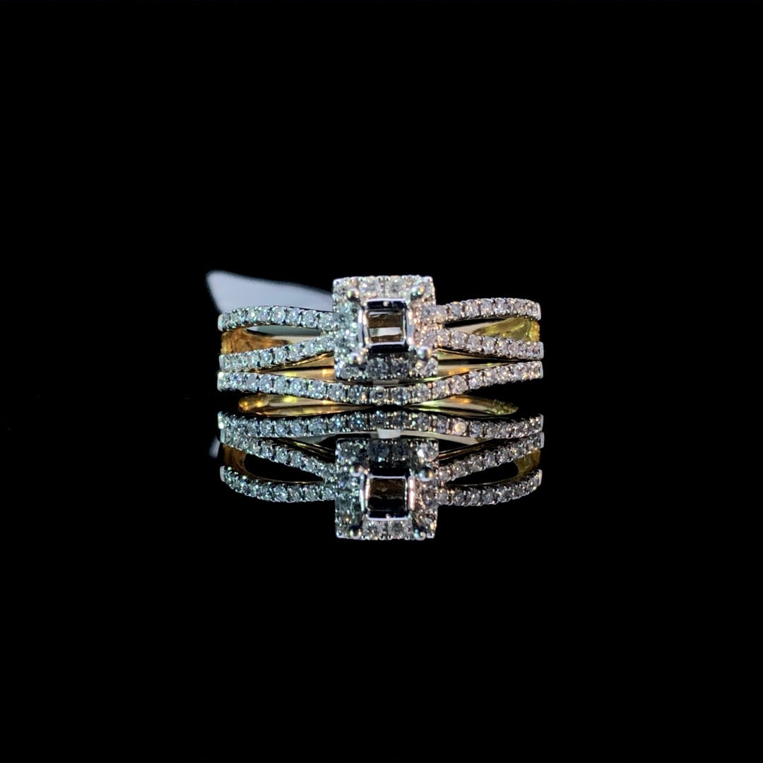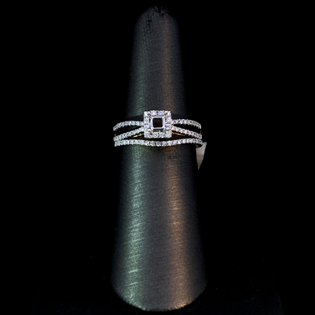 Indulge in luxury with our stunning diamond semi and band set. The semi boasts a square shape halo design with a split shank, adorned with diamonds. The matching diamond contour band completes the .35ctw set, all set in 14kt yellow gold. Personalize the set with your choice of center stone from our exquisite collection. Price is for the semi mount only. Center stone will be added at an additional cost. This ring is a size 6.5. If that size is not a perfect fit, first time sizing is free at the time of purchase. Additional sizing fees may apply.