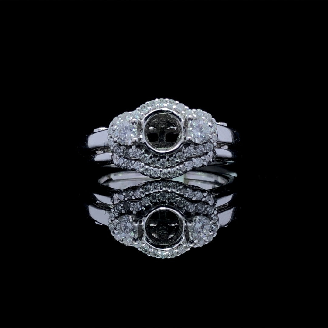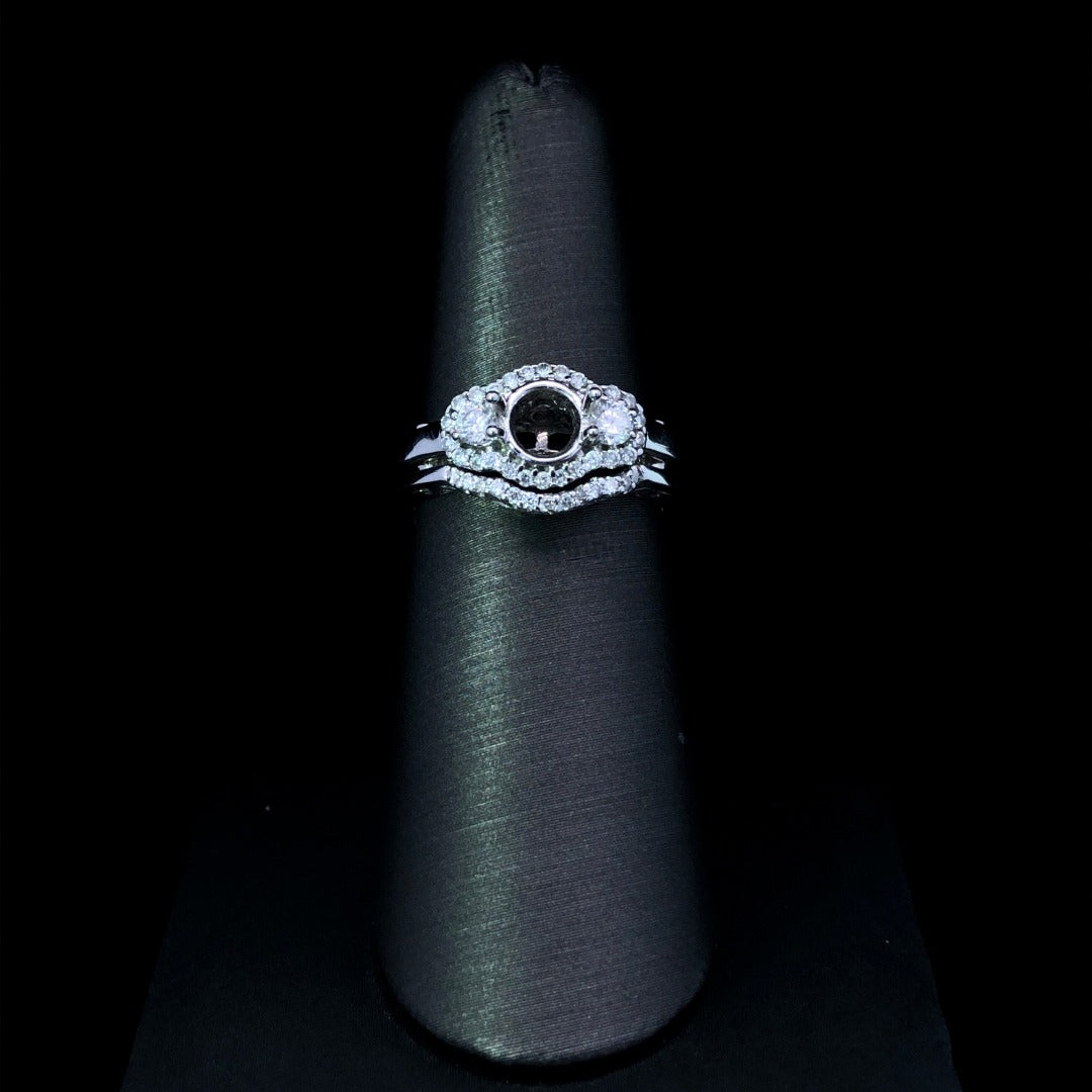 Indulge in luxury with this gorgeous diamond semi and band set. Featuring a stunning halo design with sparkling side diamonds, the matching curved band adds a touch of elegance, bringing the diamond weight to .52ctw. Choose from our vast selection of center stones to complete this 14kt white gold masterpiece. Price is for the band and semi only. Center stone will be added at an additional cost. This ring is a size 6. If that size is not a perfect fit, first time sizing is free at the time of purchase. Additional sizing fees may apply.