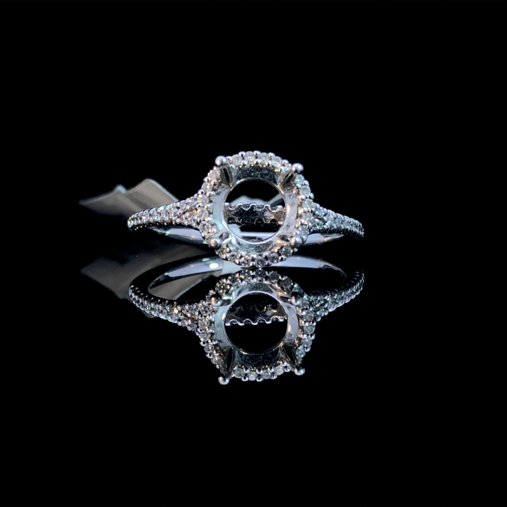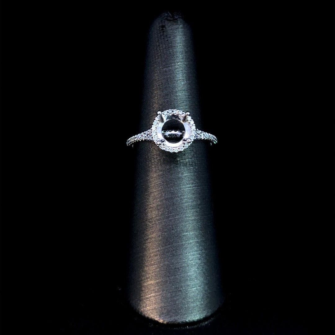 Indulge in luxury with our diamond semi mount, featuring a classic design of a round halo and split shank band adorned with .22ctw of round diamonds set in 14kt white gold. Choose from our unbeatable selection of loose stones for the perfect round center stone to complete this beautiful piece. Price is for the semi mount only. Center stone will be added at an additional cost. This ring is a size 6. If that size is not a perfect fit, first time sizing is free at the time of purchase. Additional sizing fees may apply.