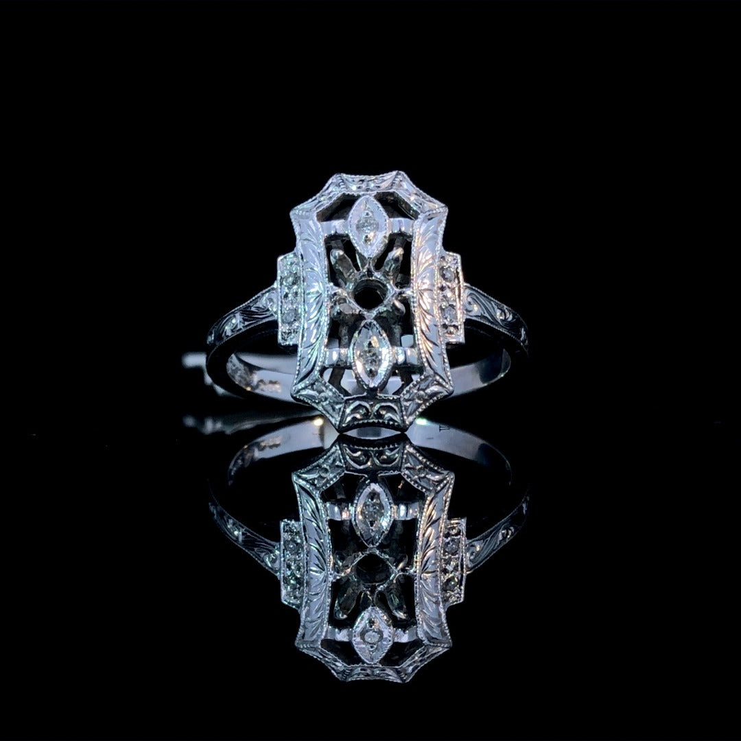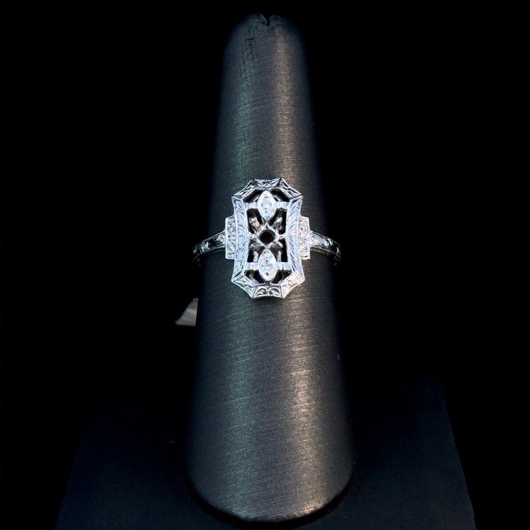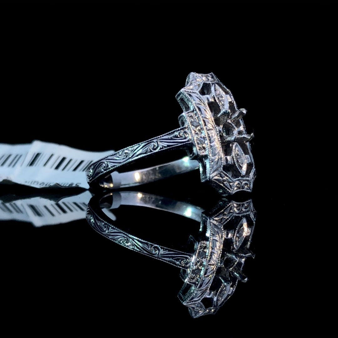 Elevate your style with this gorgeous semi mount. Crafted with exquisite filigree detailing in luxurious 14kt white gold, this vintage-inspired piece features small round accent diamonds to add subtle sparkle. Customizable with a center stone of your choosing from our wide selection, it's the perfect addition to any sophisticated jewelry collection. Price is for the semi mount only. Center stone will be added at an additional cost. This ring is a size 7.25. If that size is not a perfect fit, first time sizing is free at the time of purchase. Additional sizing fees may apply.
