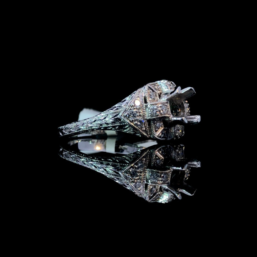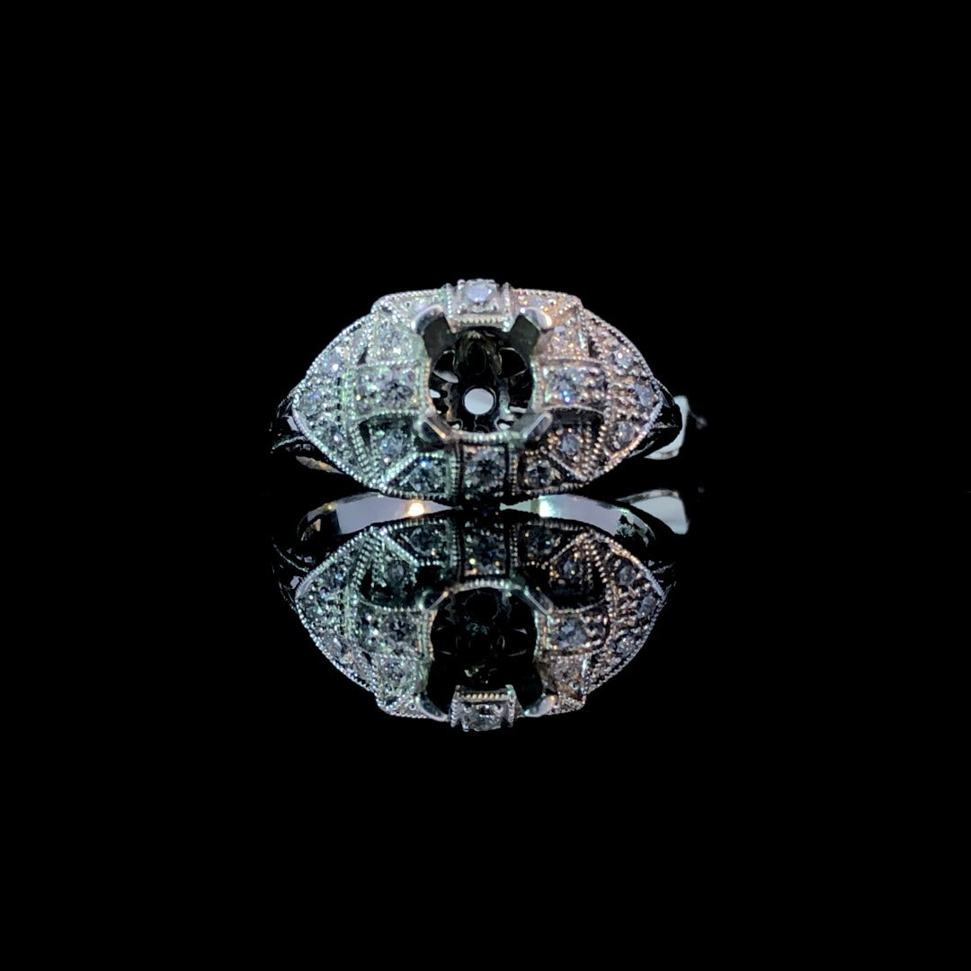 This luxurious 14kt white gold semi mount is brimming with timeless style. It features a glamorous milgrain and filigree detailed design sparkling with .31ctw of alluring diamonds, a perfect addition for those seeking a modern take on vintage elegance. Price is for the semi mount only. Center stone will be added at an additional cost. This ring is a size 6.5. If that size is not a perfect fit, first time sizing is free at the time of purchase. Additional sizing fees may apply.