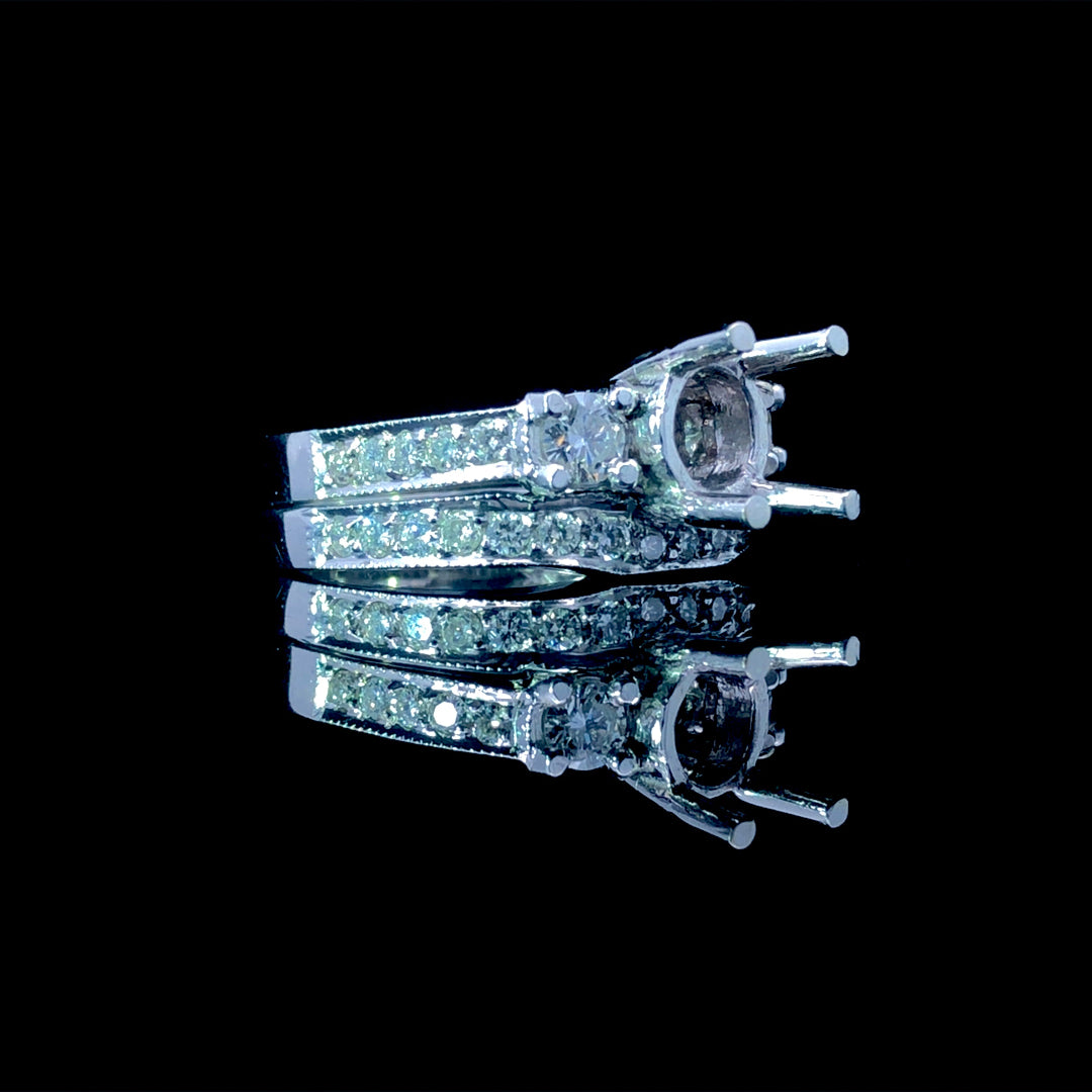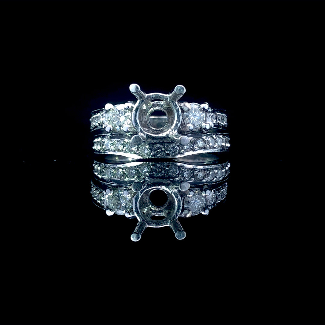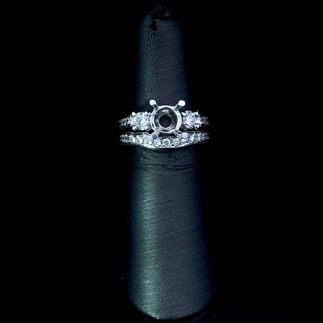 This stunning bridal set features two large round diamond side stones and smaller diamonds cascading down the band of the engagement ring semi mount. Paired with a matching diamond contour wedding band, the set offers a total carat weight of 1.03. Personalize your ring by selecting a center stone from our wide selection of loose stones to complete this elegant and timeless set. Price is for the semi and band only. Center stone will be added at an additional cost. This ring is a size 6. If that size is not a perfect fit, first time sizing is free at the time of purchase. Additional sizing fees may apply.