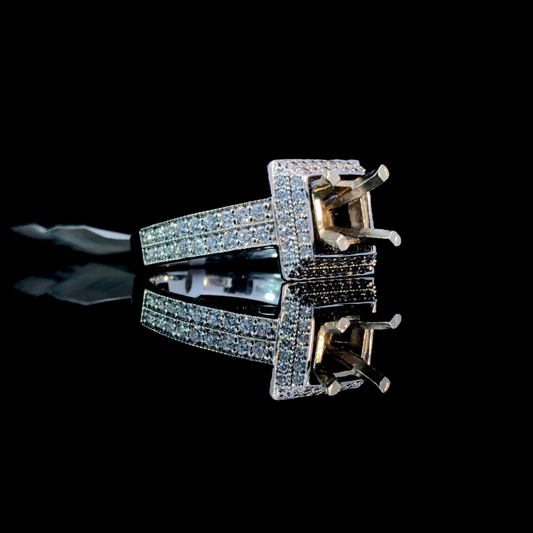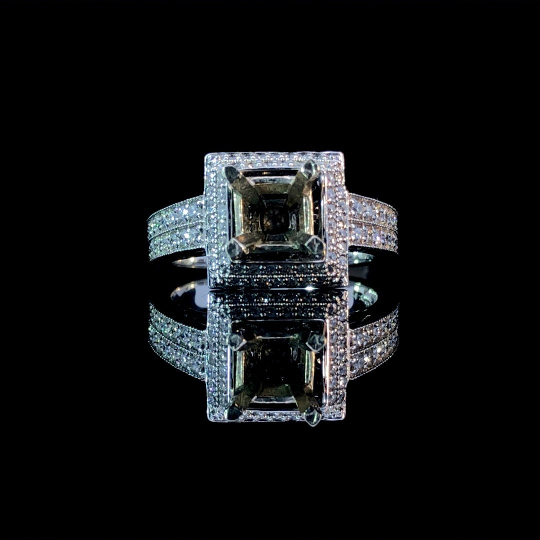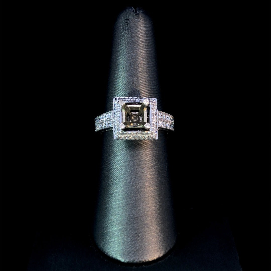 Enhance your beauty with our stunning diamond semi mount! Its square halo design and double row of diamonds on the band, set in 14kt white gold, will surely make you sparkle. With a total diamond weight of .76ctw, this timeless piece will shine for years to come. Choose from our wide range of loose stones to complete your perfect look. Price is for the semi mount only. Center stone will be added at an additional cost. This ring is a size 7. If that size is not a perfect fit, first time sizing is free at the time of purchase. Additional sizing fees may apply.