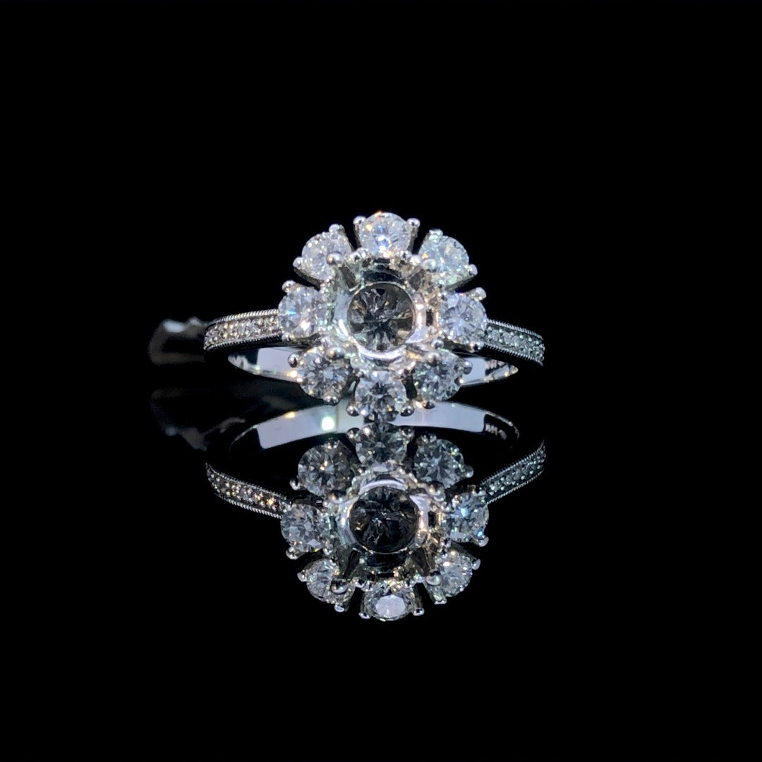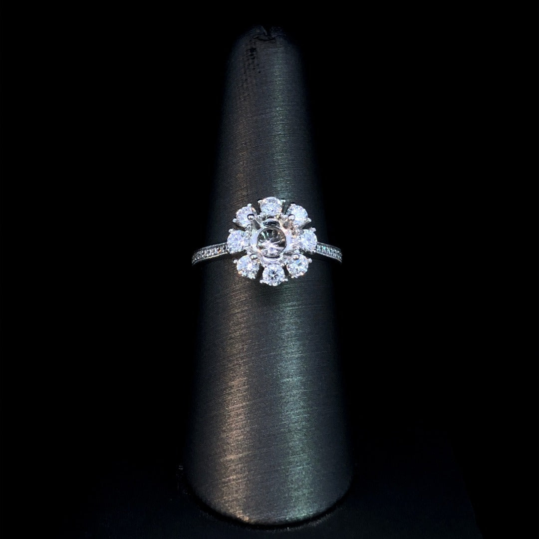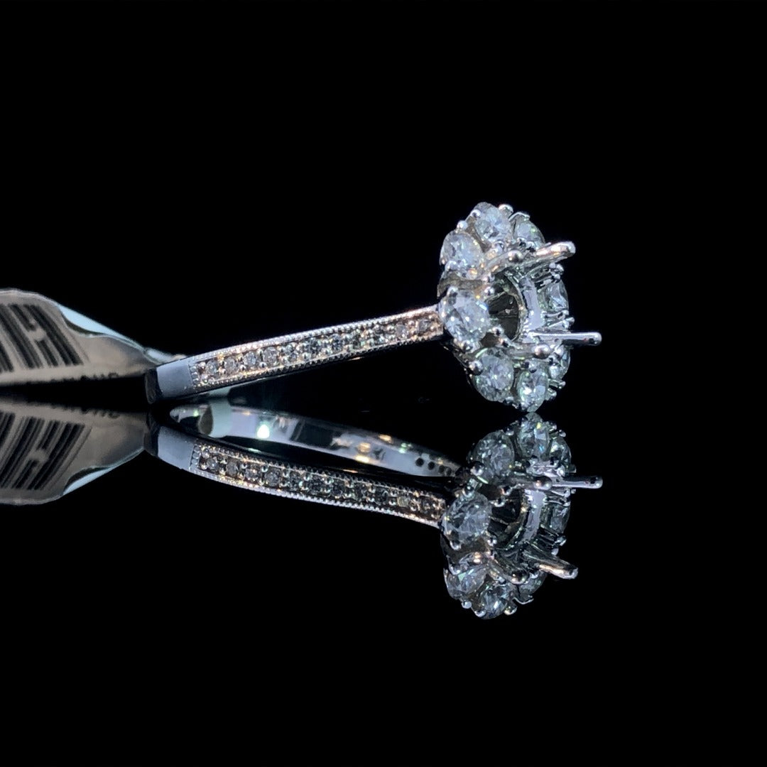 Expertly crafted with .75ctw of round diamonds, this 14kt white gold semi-mount features a sparkling halo surrounding your chosen center stone. Smaller diamonds line the band for added brilliance. Personalize it with our unbeatable selection of loose stones. Elevate your proposal with elegance and radiance. Price is for the semi mount only. Center stone will be added at an additional cost. This ring is a size 6.75. If that size is not a perfect fit, first time sizing is free at the time of purchase. Additional sizing fees may apply.