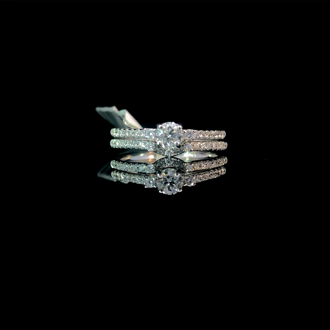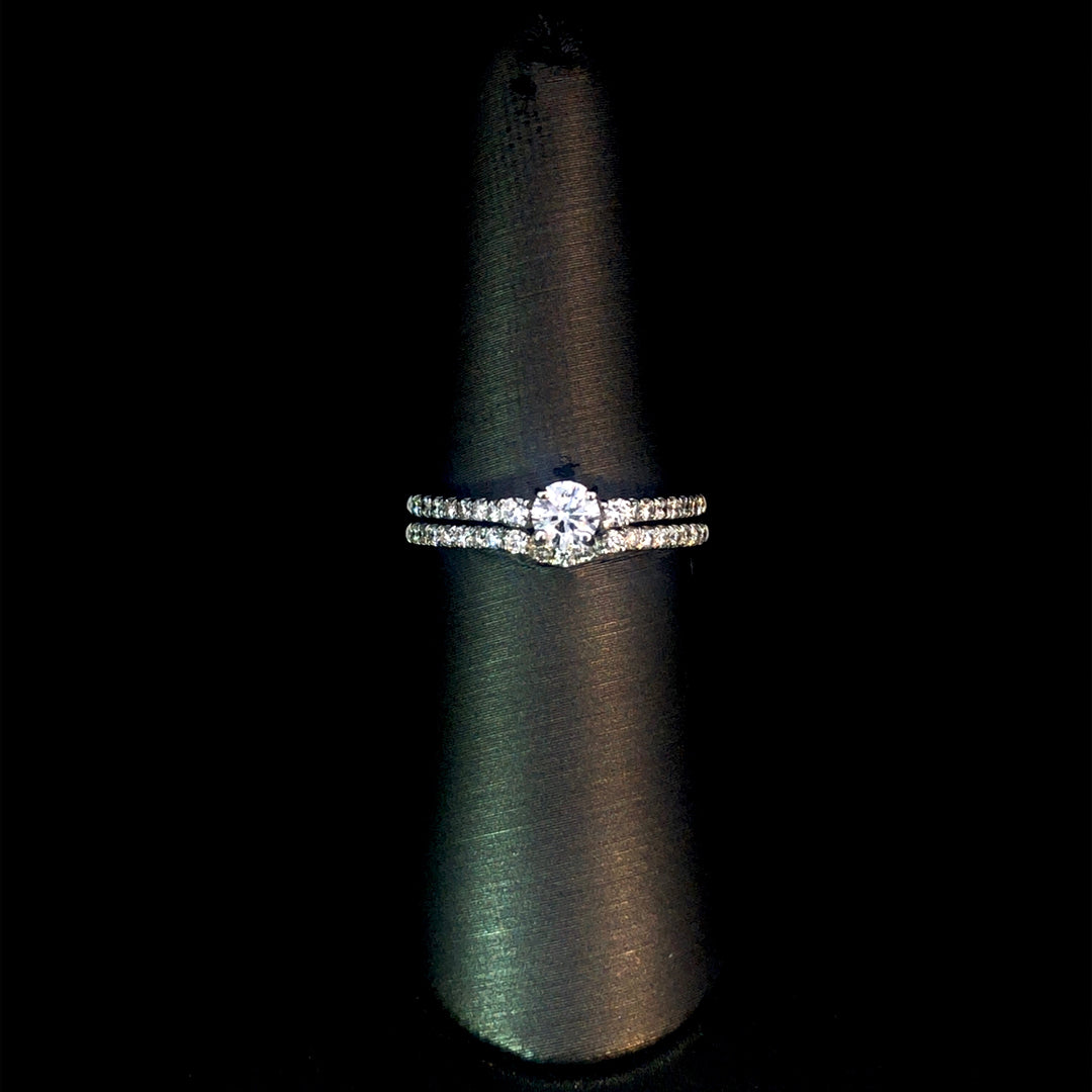 This stunning diamond bridal set features a .28ct round diamond center stone, complemented by 2 smaller round diamonds and additional diamonds cascading down the band. The matching diamond contour band adds an elegant touch, with a total diamond weight of .70ctw, all set in 14kt white gold. Elevate your special day with this breathtaking set. This set is a size 7. If that size is not a perfect fit, first time sizing is free at the time of purchase. Additional sizing fees may apply.