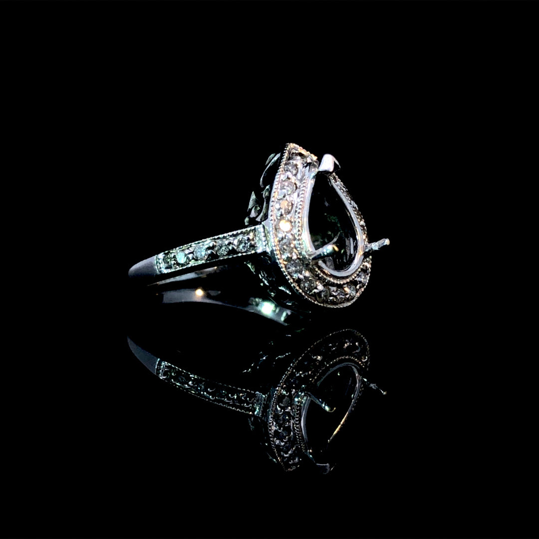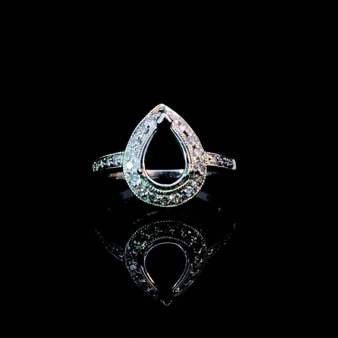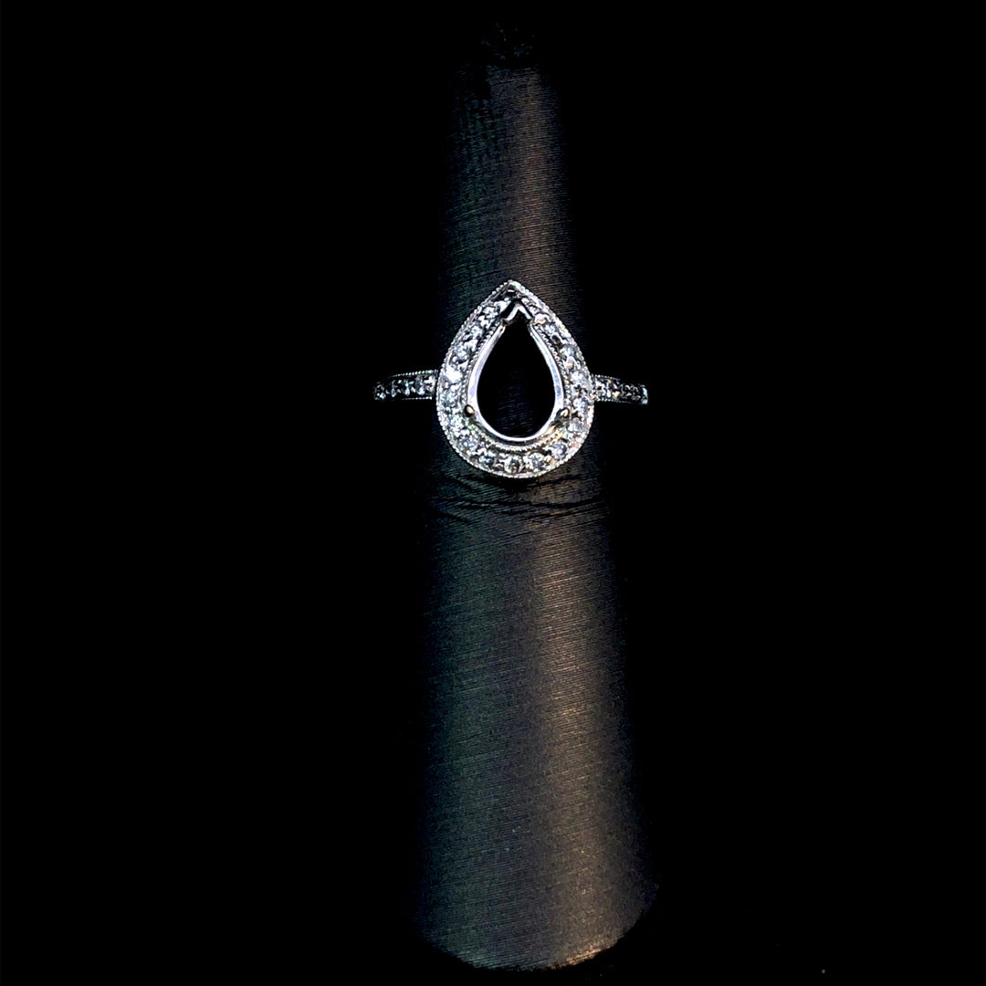 This elegant semi mount showcases a stunning pear-shaped halo design, and sparkling round diamonds that dance along the band. Crafted in 14kt white gold with delicate milgrain detailing, this piece combines timeless sophistication with modern elegance. Featuring .28ctw of premium diamonds, it's the perfect foundation for your dream engagement ring, allowing you to select a center stone that reflects your unique style and vision. Price is for the semi mount only. Center stone will be added at an additional cost. This ring is a size 7. If that size is not a perfect fit, first time sizing is free at the time of purchase. Additional sizing fees may apply.