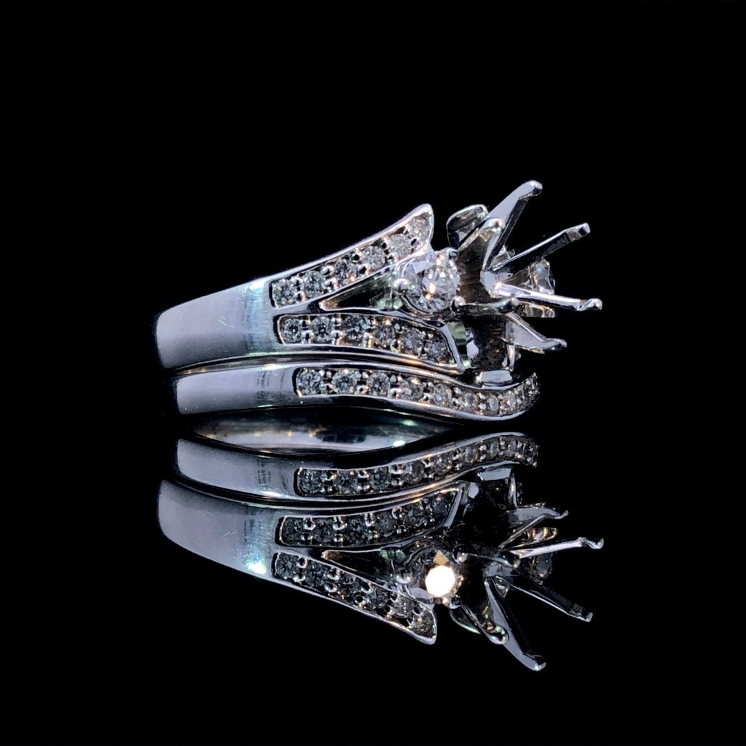 Create a luxurious and sentimental statement piece with our stunning diamond semi mount. Adorned with .49ctw of round diamonds in 14kt white gold, simply add your chosen center stone from our unparalleled collection of loose stones. Complete the stunning set with the matching .14ctw diamond contour band (sold separately). Price is for the semi mount only. Center stone and band will be added at an additional cost. This ring is a size 7. If that size is not a perfect fit, first time sizing is free at the time of purchase. Additional sizing fees may apply.