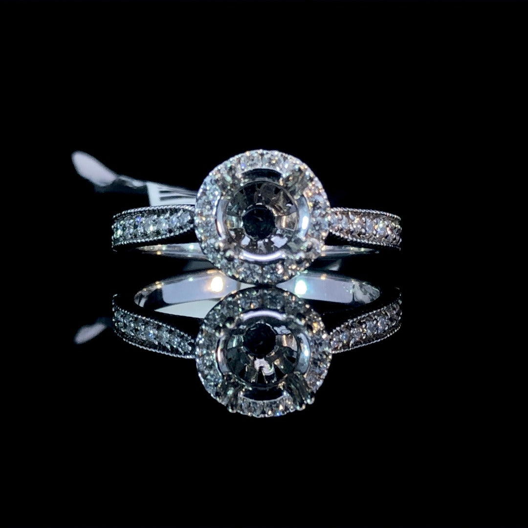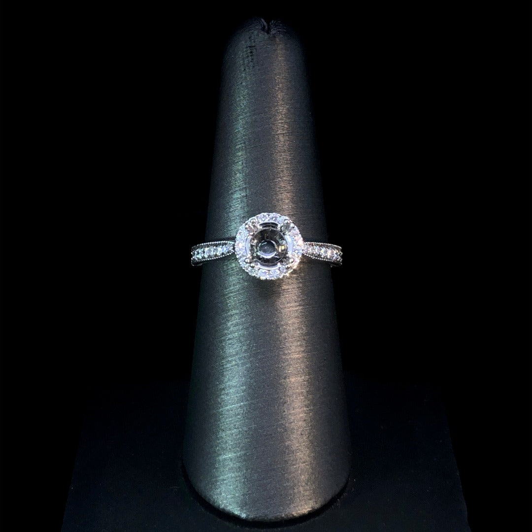 Our classic diamond halo semi mount is the perfect way to show off the round diamond of your choice. Crafted with 14kt white gold, it features .44ctw of round diamonds with miligrain edges, creating a timeless yet luxurious look. Price is for the semi mount only. Center stone will be added at an additional cost. This ring is a size 7. If that size is not a perfect fit, first time sizing is free at the time of purchase. Additional sizing fees may apply.
