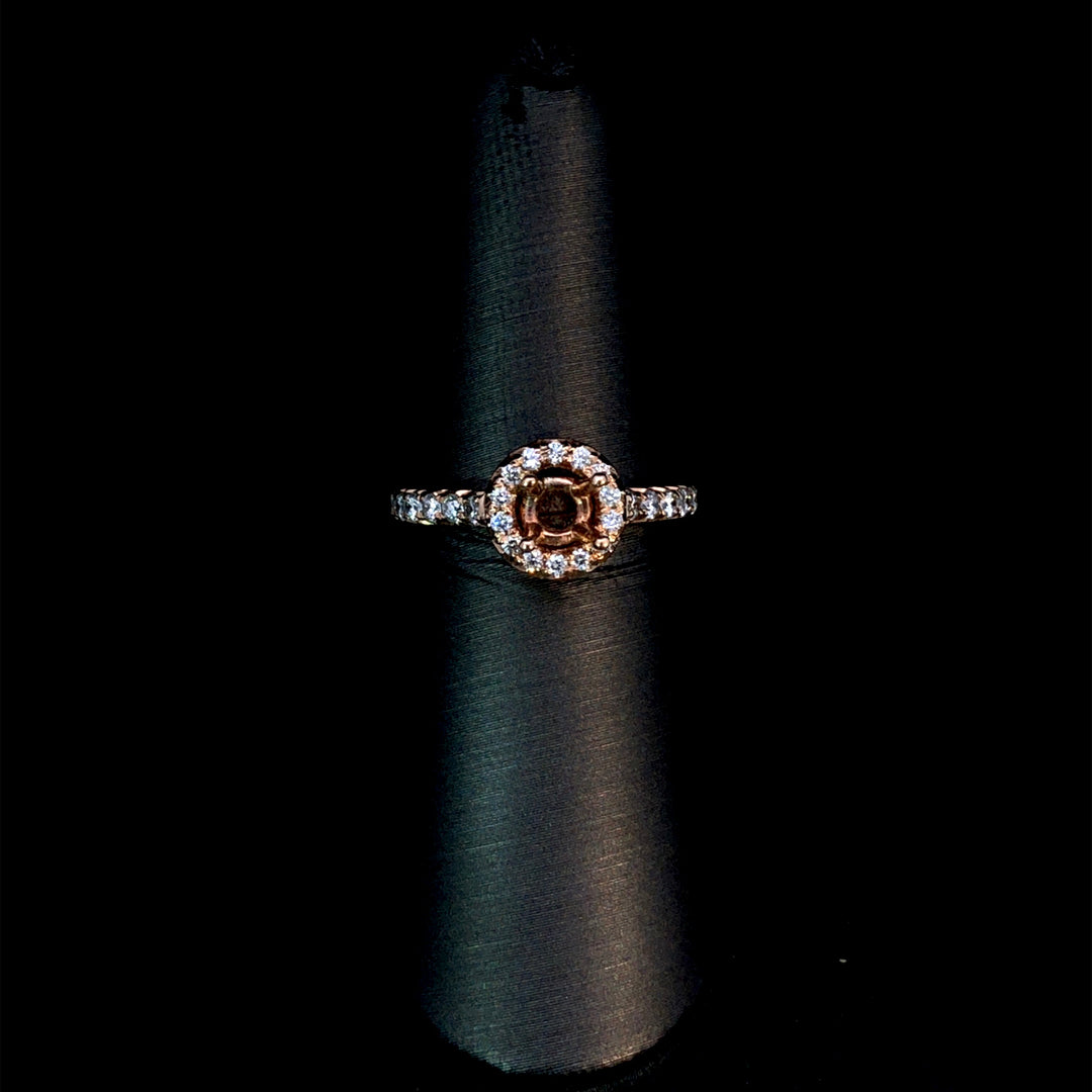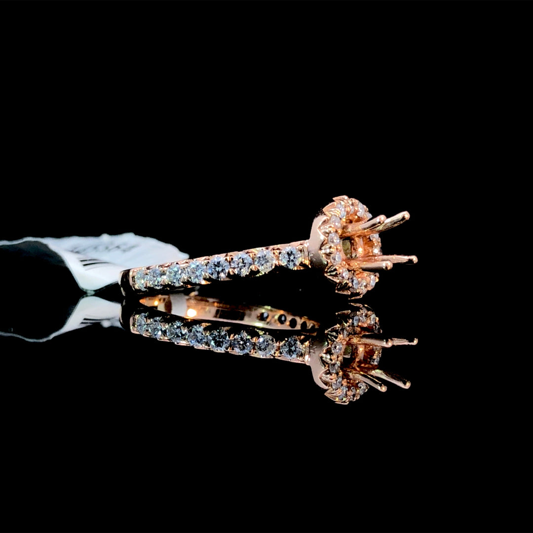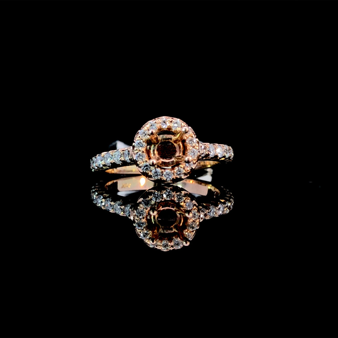 This beautiful 14kt rose gold semi-mount showcases a round halo and diamonds along the band, totaling .62ctw of sparkle. Create your dream ring by choosing the perfect center stone from our selection of loose stones to complete this stunning piece. Price is for the semi mount only. Center stone will be added at an additional cost. This ring is a size 6.25. If that size is not a perfect fit, first time sizing is free at the time of purchase. Additional sizing fees may apply.