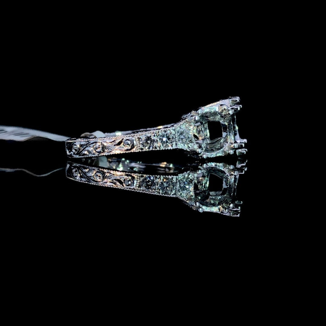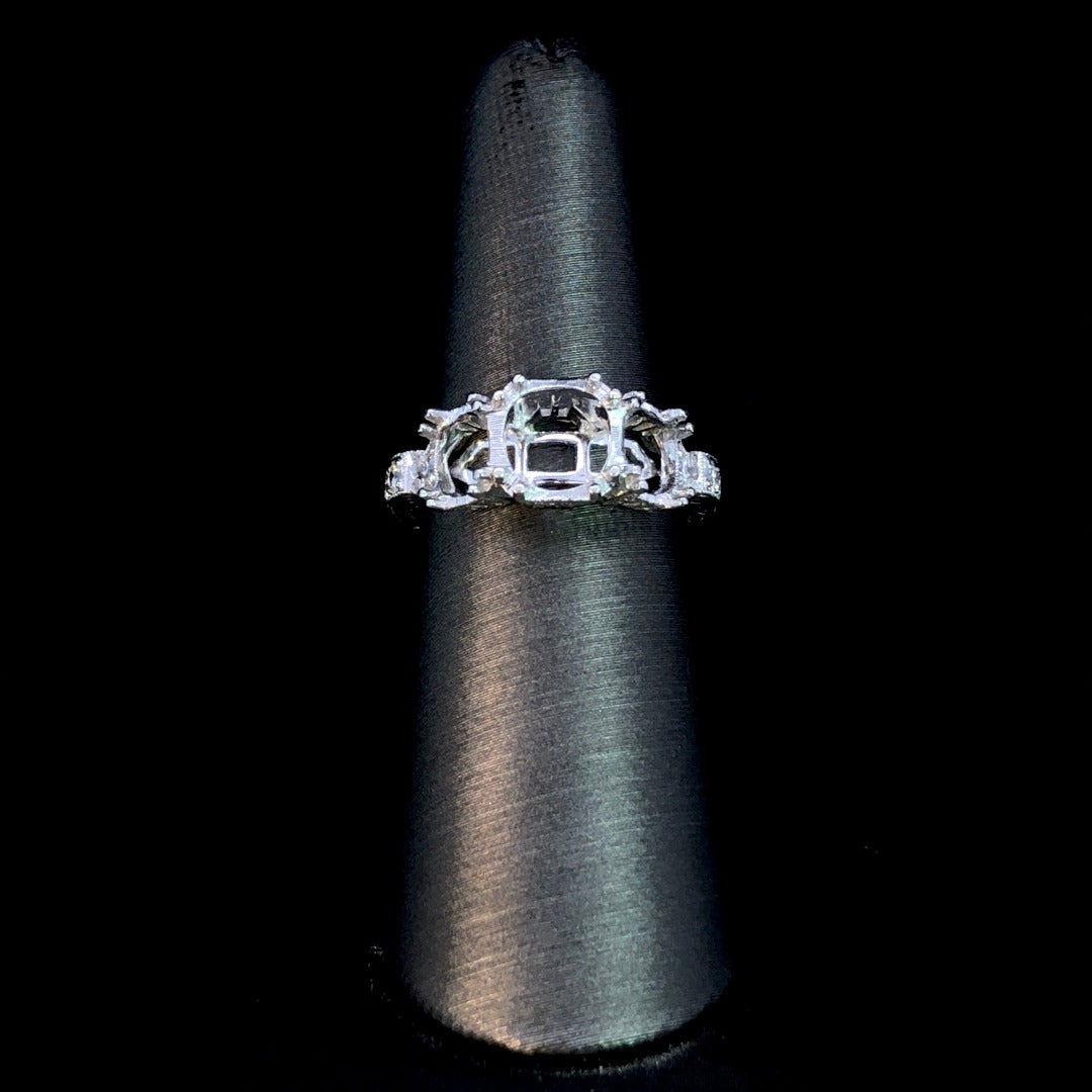 Embrace your past, present, and future with this exquisite ring. Crafted in 14kt white gold, it showcases a stunning 3 stone design adorned with .22ctw of shimmering round accent diamonds, intricate etchings, and delicate milgrain details. Personalize with your choice of center stones from our exceptional selection to create a one-of-a-kind masterpiece. Price is for the semi mount only. Center stones will be added at an additional cost. This ring is a size 6.5. If that size is not a perfect fit, first time sizing is free at the time of purchase. Additional sizing fees may apply.