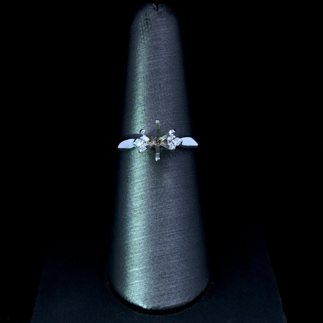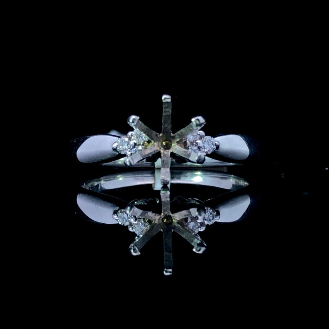This classic diamond semi mount shines with timeless elegance. Expertly crafted with a head to hold a center stone of your choice and 3 round diamonds on either side, it creates a dazzling sparkle with a total weight of .09ctw set in 14kt white gold. Perfect for those looking for a simple yet elegant look that will last for years. Price is for the semi mount only. Center stone will be added at an additional cost. This ring is a size 7. If that size is not a perfect fit, first time sizing is free at the time of purchase. Additional sizing fees may apply.