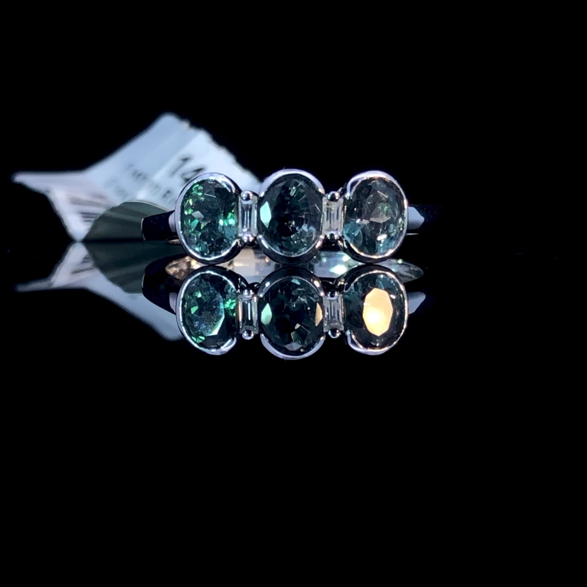 This beautiful .95 ctw alexandrite and diamond ring features 3 oval alexandrites with baguette accent diamonds set in 14 kt white gold. This stunning piece is sure to make a statement and add a luxurious touch of color and sparkle to any outfit. Ring is a size 7 and can be sized at the time of purchase for the first time for free. Additional sizing fees may apply.