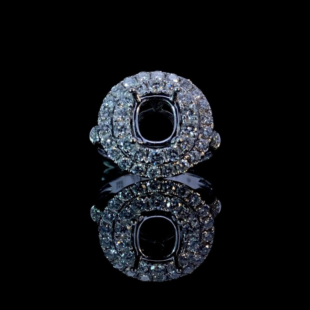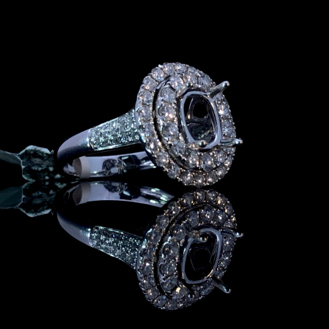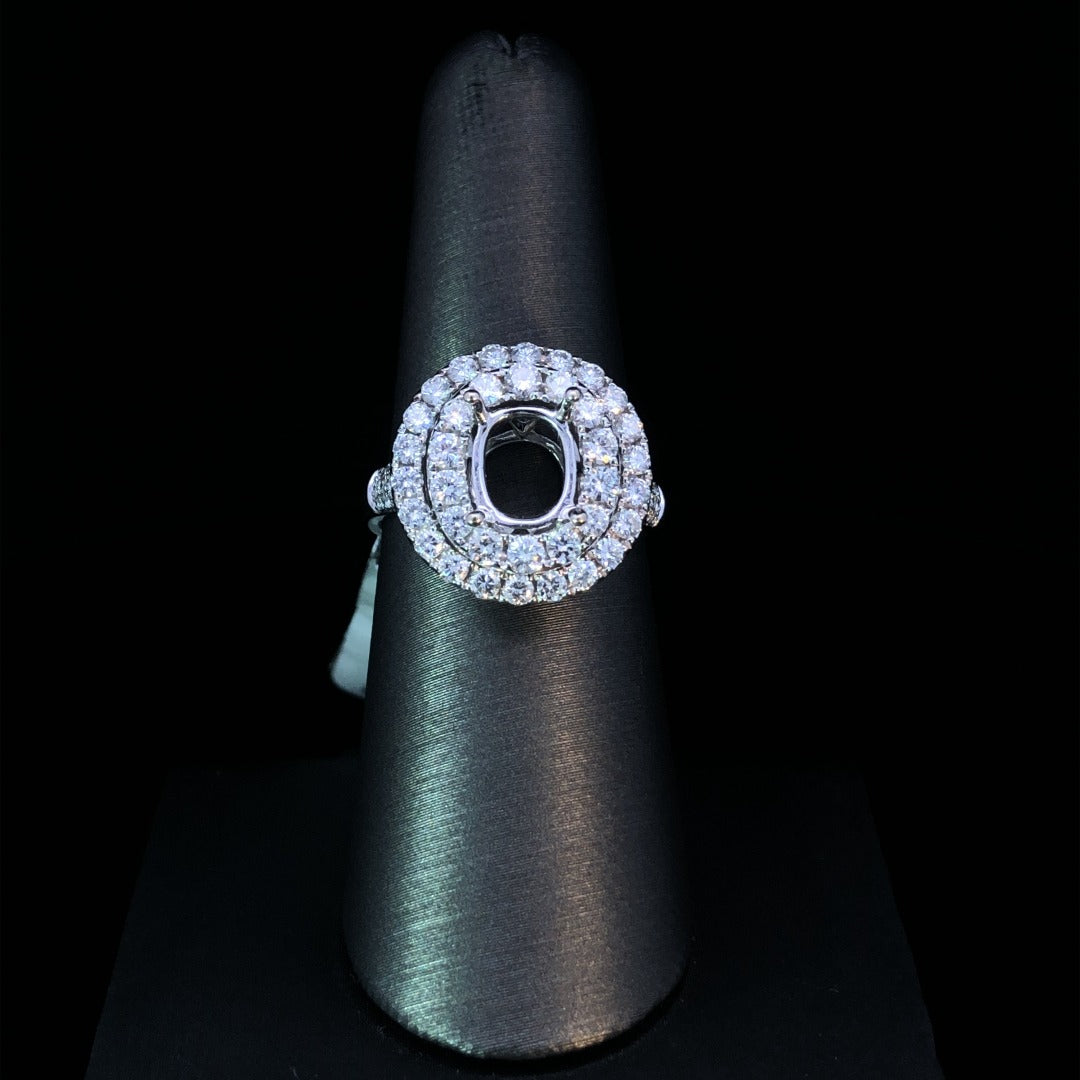 This 14kt white gold diamond semi mount is a stunning example of craftsmanship. Boasting a double halo design and a band showcasing pave set diamonds, it makes an impressive statement, weighing in at 1.38ctw. The perfect accompaniment to a special oval center stone that you get to pick yourself, this semi mount radiates sophistication and elegance. Price is for the semi mount only. Center stone will be added at an additional cost. This ring is a size 7. If that size is not a perfect fit, first time sizing is free at the time of purchase. Additional sizing fees may apply.