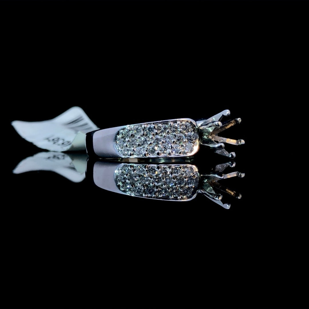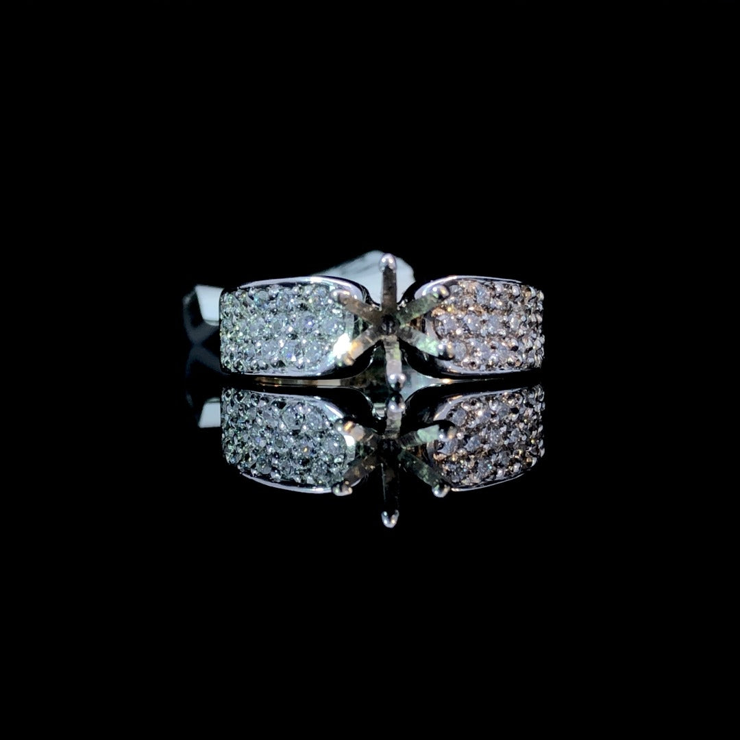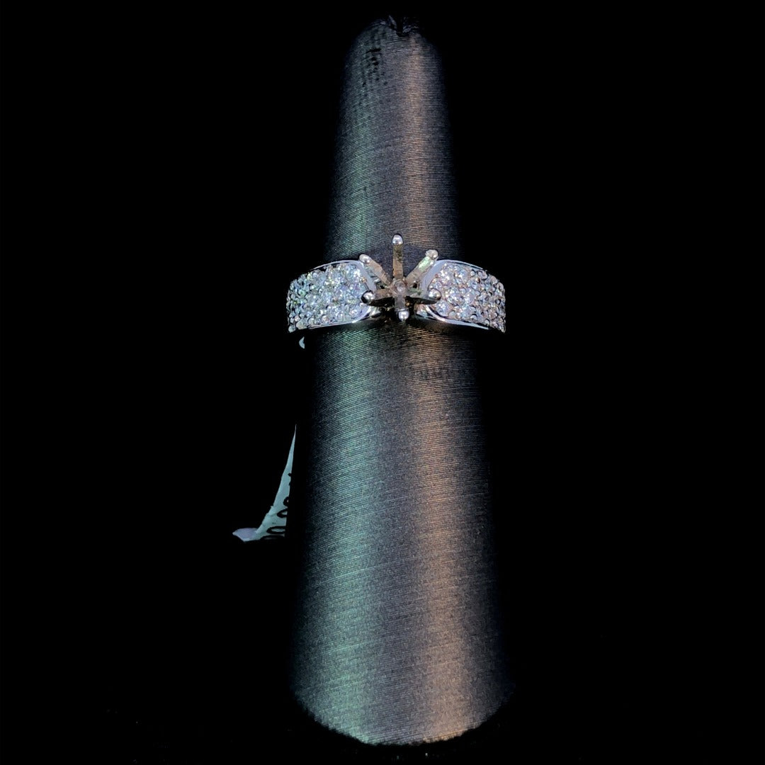 Elevate your style with our stunning diamond semi mount. Adorned with .82ctw of sparkling round diamonds set in 14kt white gold, this piece will add a touch of luxury to any outfit. Personalize it with your choice of center stone from our collection for a truly unique statement. Price is for the semi mount only. Center stone will be added at an additional cost. This ring is a size 6. If that size is not a perfect fit, first time sizing is free at the time of purchase. Additional sizing fees may apply.