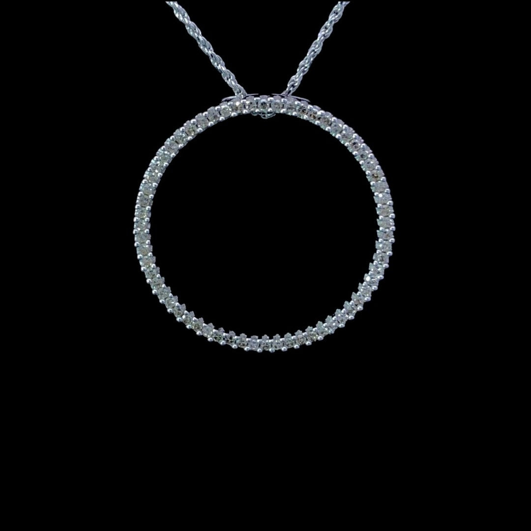 This chic 14kt white gold circle pendant is exquisitely adorned with .50ctw of round diamonds, evoking a classic yet modern elegance that is sure to be a timeless addition to your jewelry collection. This luxurious piece will lend a dazzling sparkle for every occasion. Chain is not included.