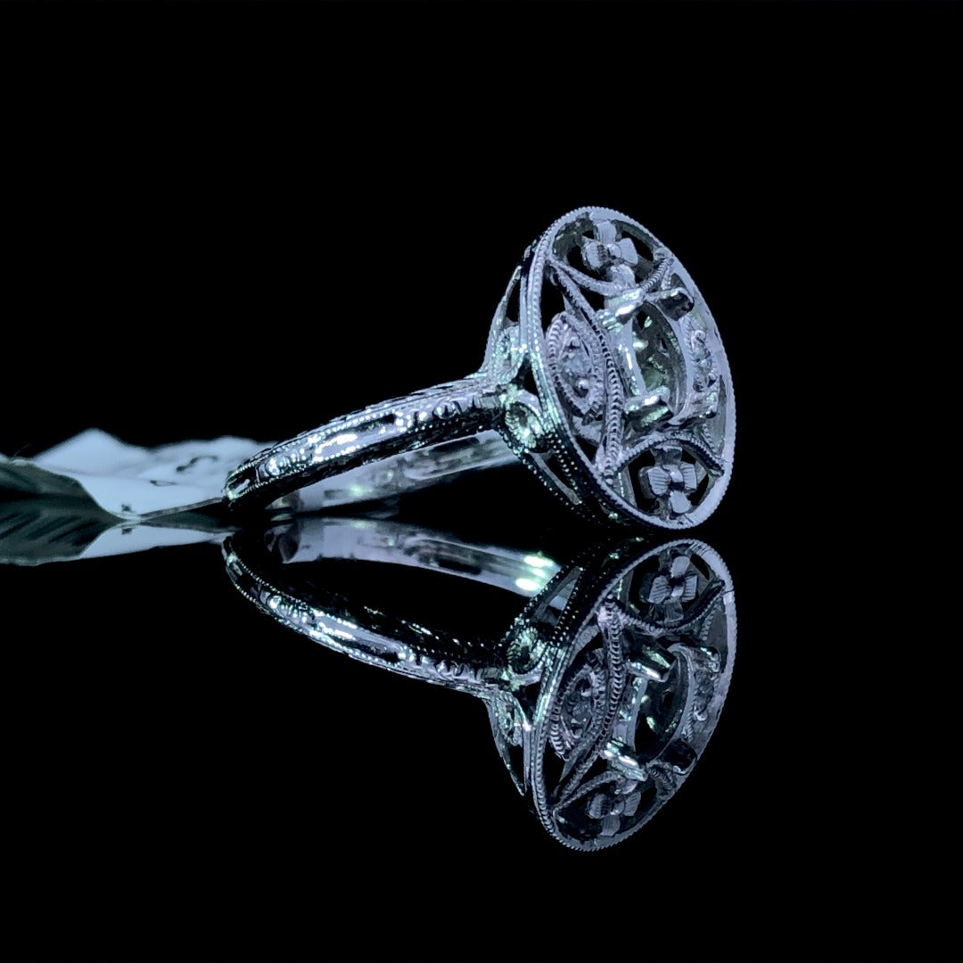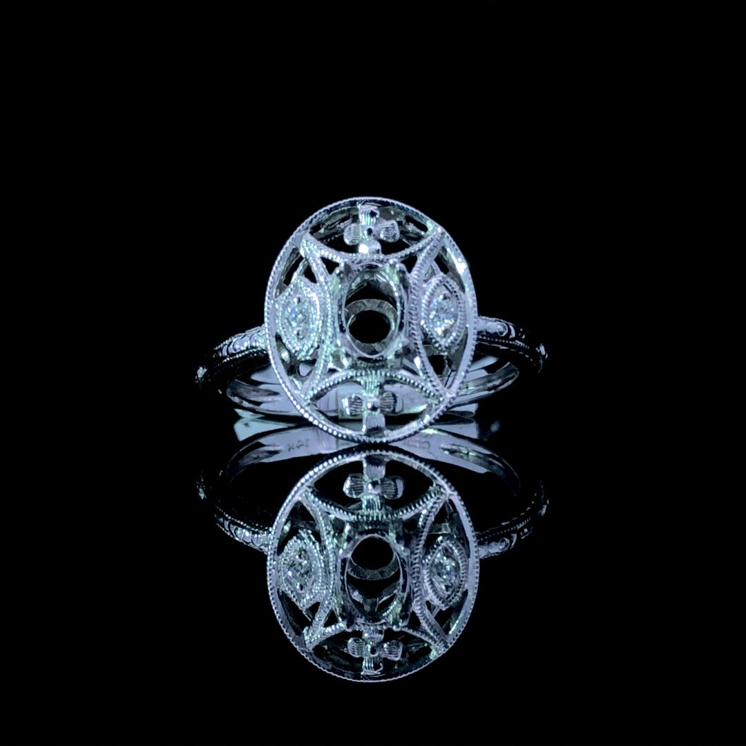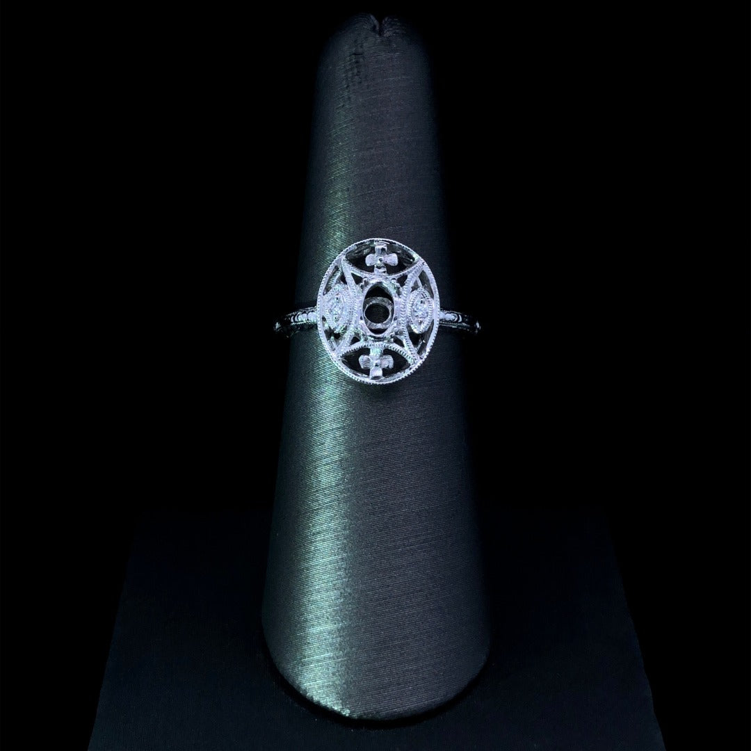 Transform your dream ring into reality with our vintage-inspired diamond semi mount. The exquisite filigree and milgrain details are adorned with sparkling .03ctw diamond accents. Choose from our wide range of loose stones to add the perfect touch to this stunning design. Price is for the semi mount only. Center stone will be added at an additional cost. This ring is a size 6.5. If that size is not a perfect fit, first time sizing is free at the time of purchase. Additional sizing fees may apply.