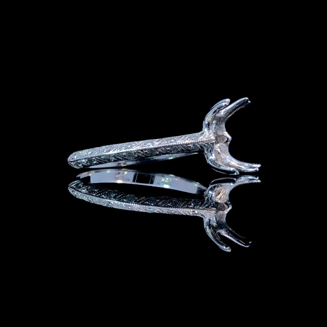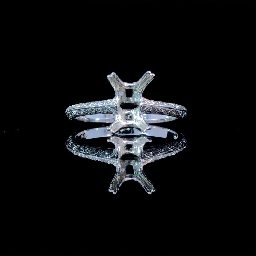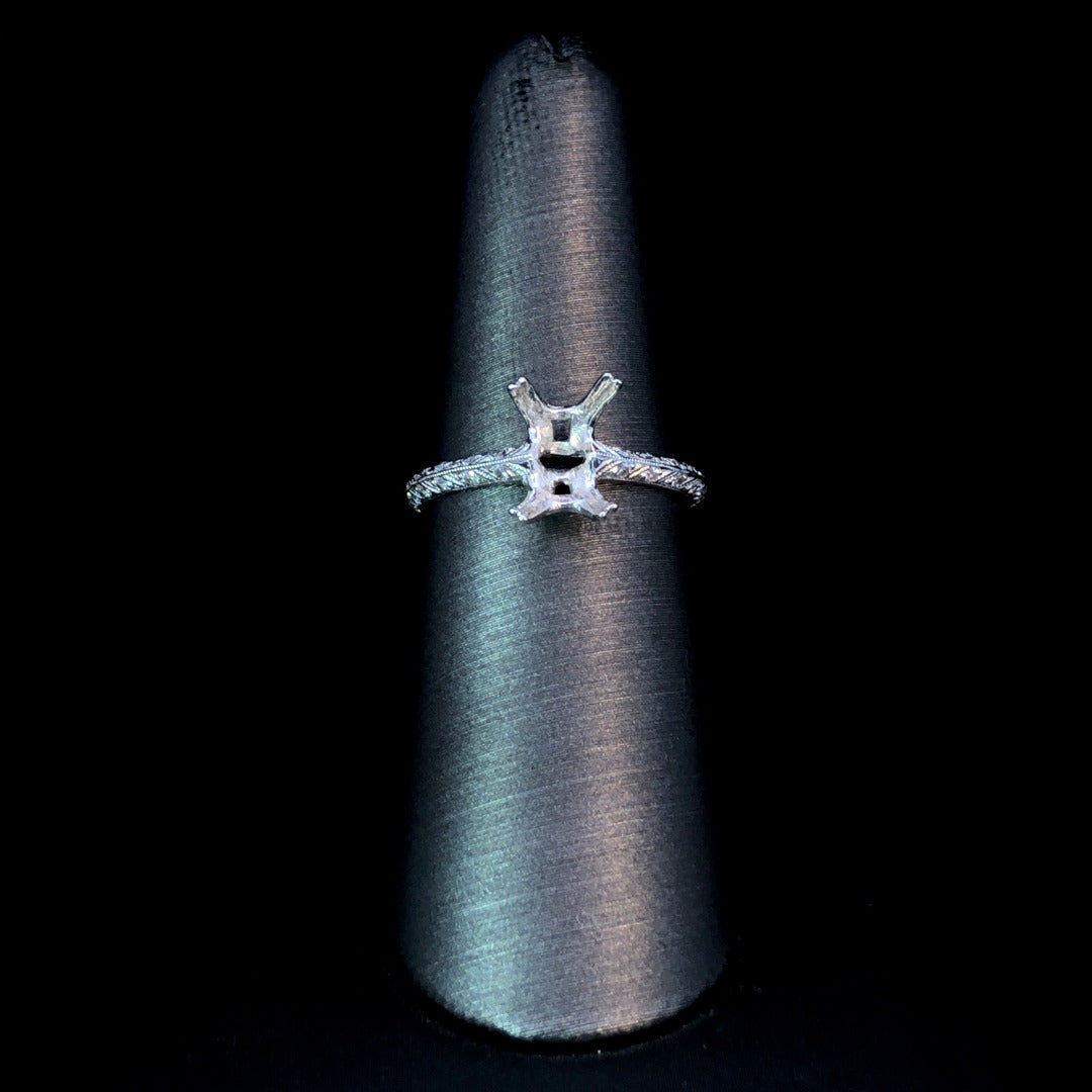 Elevate your look with our stunning 14kt white gold semi mount, featuring a detailed etched band and sparkling with .24ctw of round diamond accents. Add your personal touch with a center stone from our unbeatable collection of loose stones. Make a bold statement with this exclusive piece. Price is for the semi mount only. Center stone will be added at an additional cost. This ring is a size 6.5. If that size is not a perfect fit, first time sizing is free at the time of purchase. Additional sizing fees may apply.