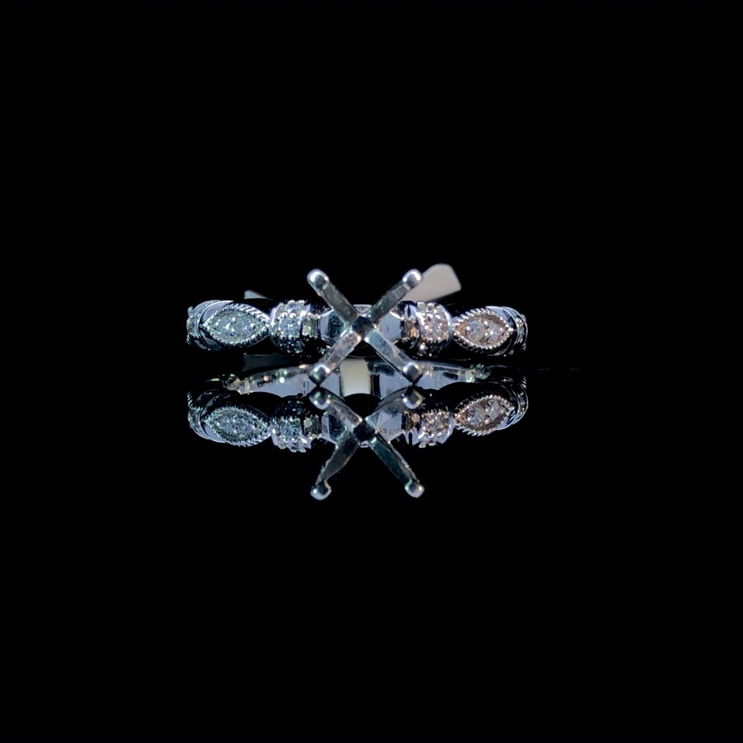 Elevate your style with our chic diamond semi mount, featuring a trendy design and .23ctw of sparkling round diamonds. The 14kt white gold setting is accentuated with milgrain detailing for added allure. Choose your own center stone from our wide selection of loose stones to complete this stunning piece. Price is for the semi mount only. Center stone will be added at an additional cost. This ring is a size 6. If that size is not a perfect fit, first time sizing is free at the time of purchase. Additional sizing fees may apply.