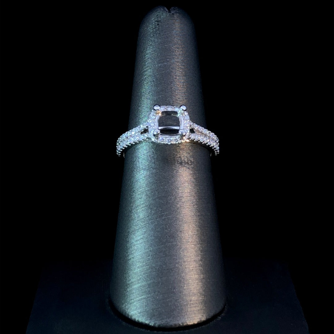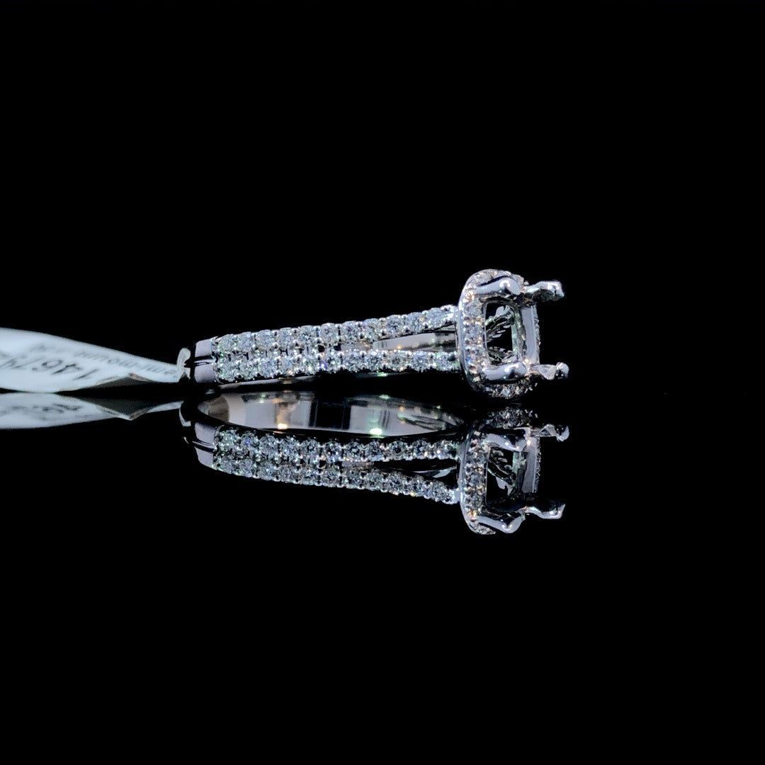 Treat yourself to pure luxury with this gorgeous 14kt white gold semi mount, featuring a halo and split shank design with an exquisite .34ctw of round diamonds. Exuding luxury and sparkle, this semi mount brings timeless elegance to any piece of jewelry. Make this masterpiece yours today! Price is for the semi mount only. Center stone will be added at an additional cost. Ring is a size 6.5. If that size is not a perfect fit, first time sizing is free at the time of purchase. Additional sizing fees may apply.