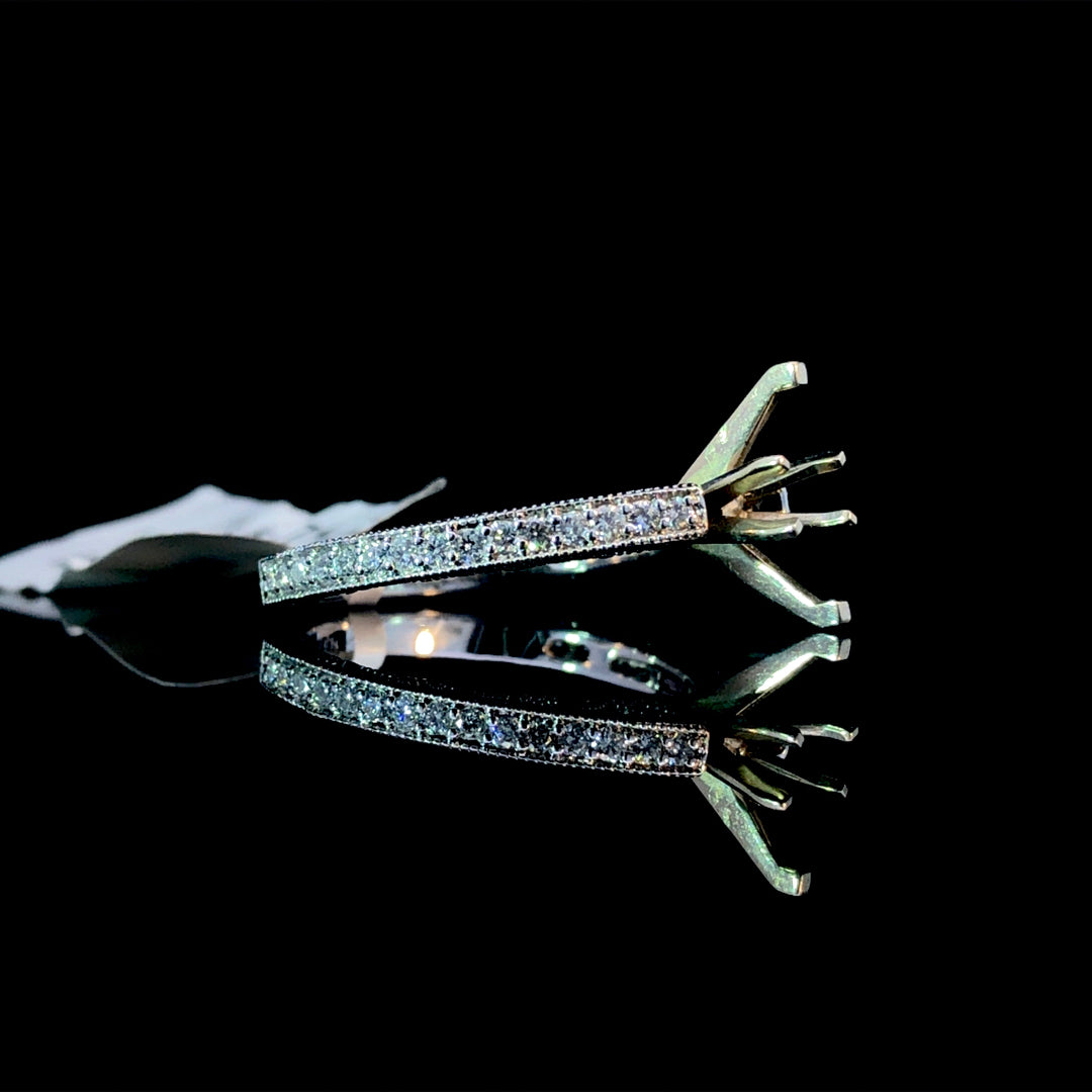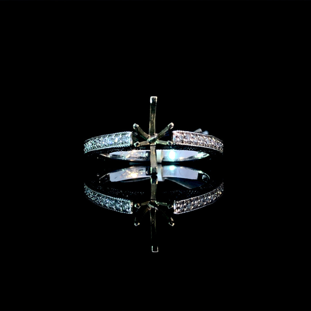 This diamond semi-mount combines classic elegance with unique details, featuring 0.30ctw of round diamonds along the 14kt white gold band. Milgrain accents and intricate filigree beneath the head add refined charm. Customize this timeless piece by selecting any size or shape center stone from our extensive collection of loose diamonds to create a truly personalized ring. Price is for the semi mount only. Center stone will be added at an additional cost. This ring is a size 7. If that size is not a perfect fit, first time sizing is free at the time of purchase. Additional sizing fees may apply.