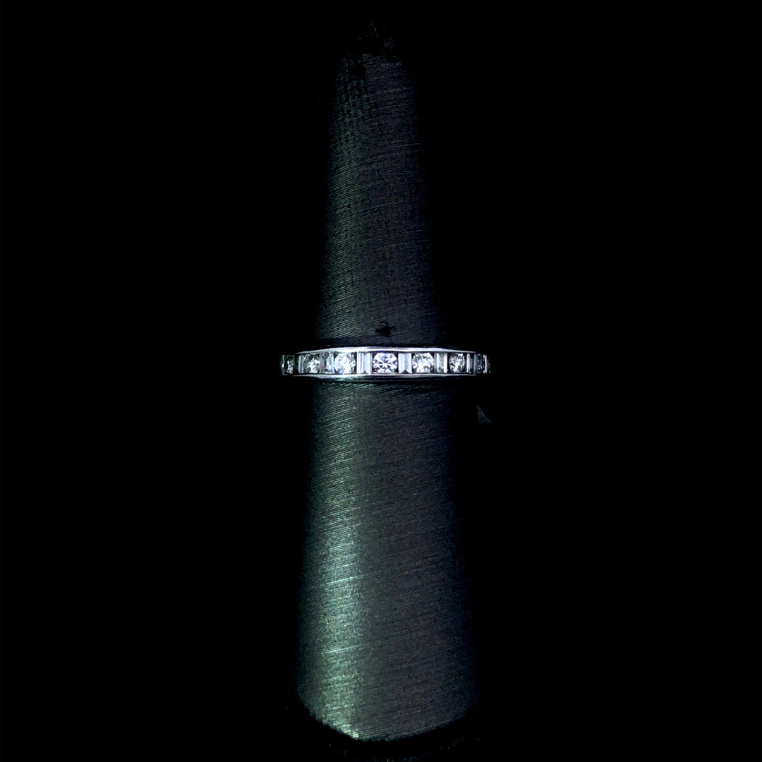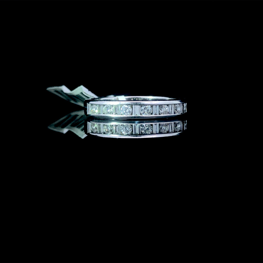 Enhance your everyday look with this gorgeous diamond band. Crafted in 14kt white gold, this elegant piece features alternating round and baguette diamonds in a channel setting totaling .50ctw. Add a touch of sparkle and sophistication to any outfit with this stunning accessory. This ring is a size 7. If that size is not a perfect fit, first time sizing is free at the time of purchase. Additional sizing fees may apply.