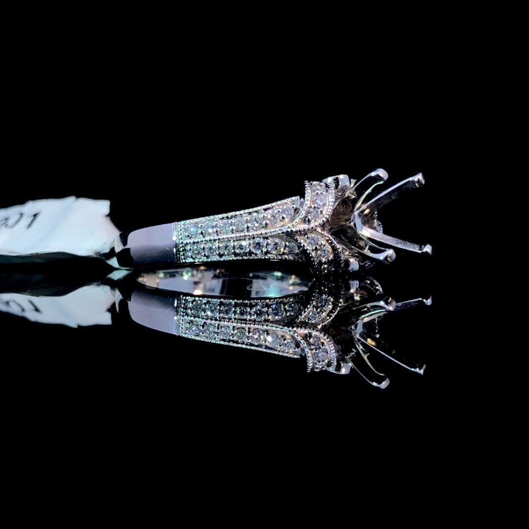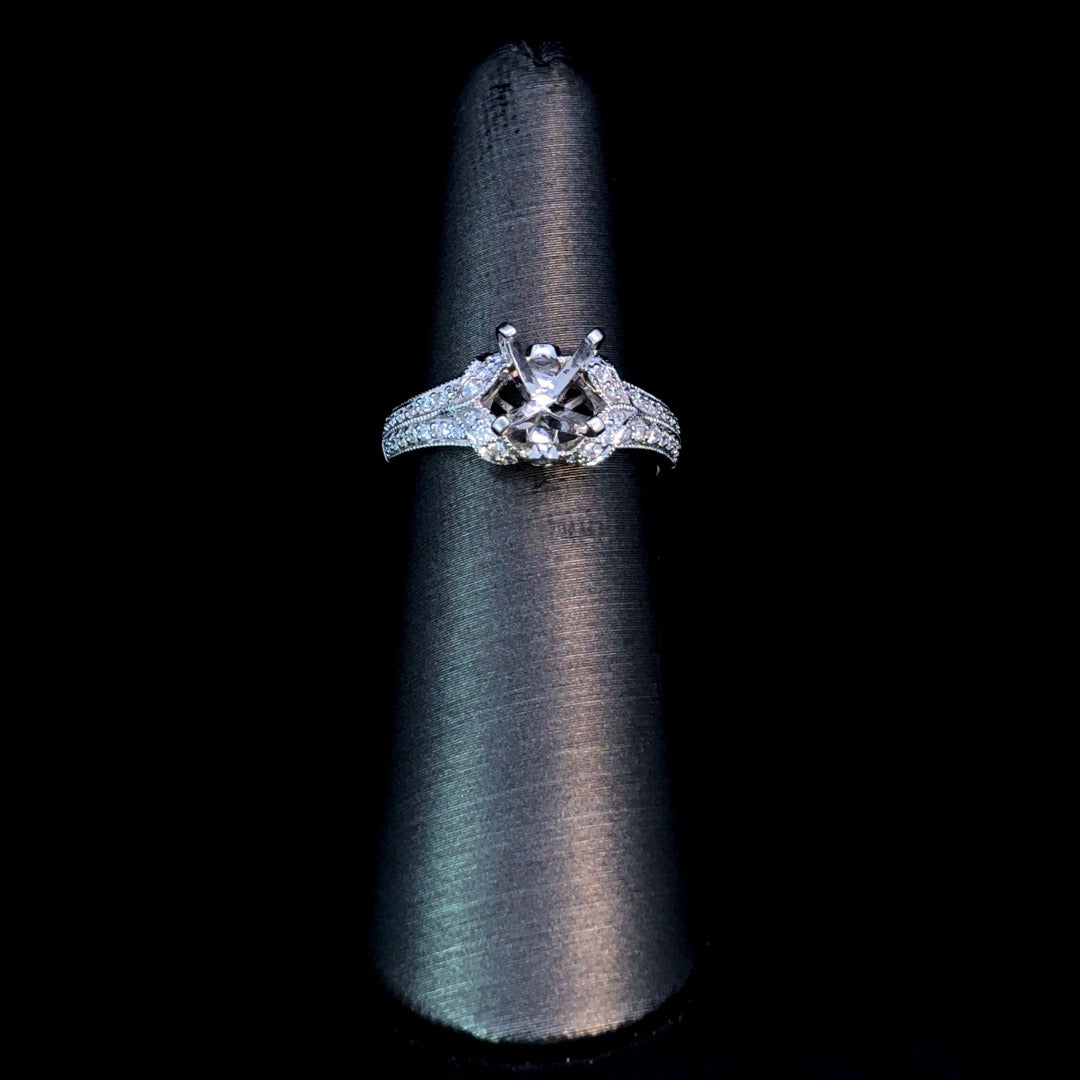 This diamond semi mount boasts a stunning design with .24ctw of round diamonds and milgrain detailing. Made of 14kt white gold, it can be paired with any center stone from our loose stone collection for a truly unique and beautiful ring. Perfect for those looking for a personalized and exquisite piece of jewelry. Price is for the semi mount only. Center stone will be added at an additional cost. This ring is a size 6. If that size is not a perfect fit, first time sizing is free at the time of purchase. Additional sizing fees may apply.
