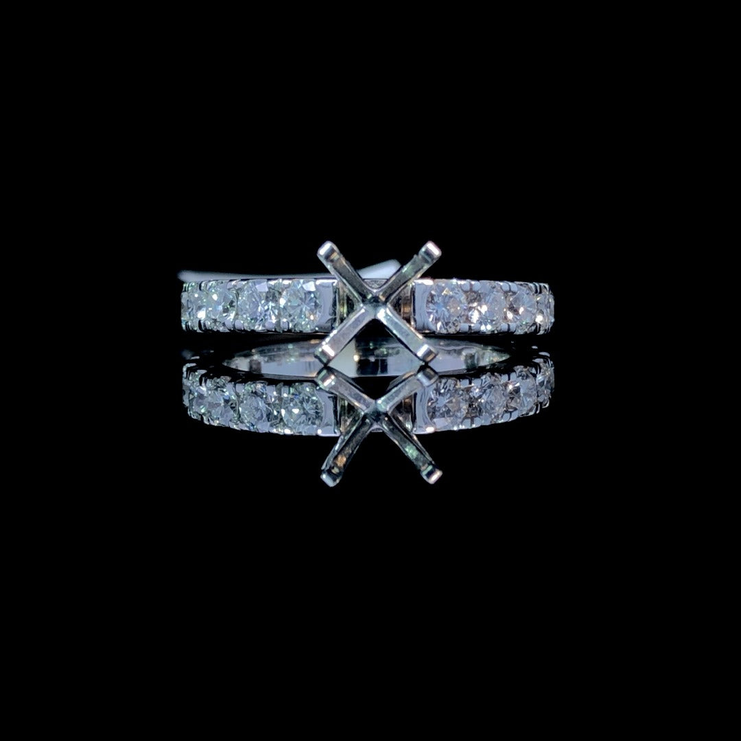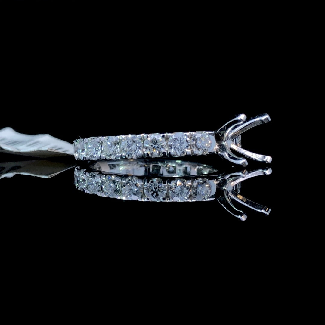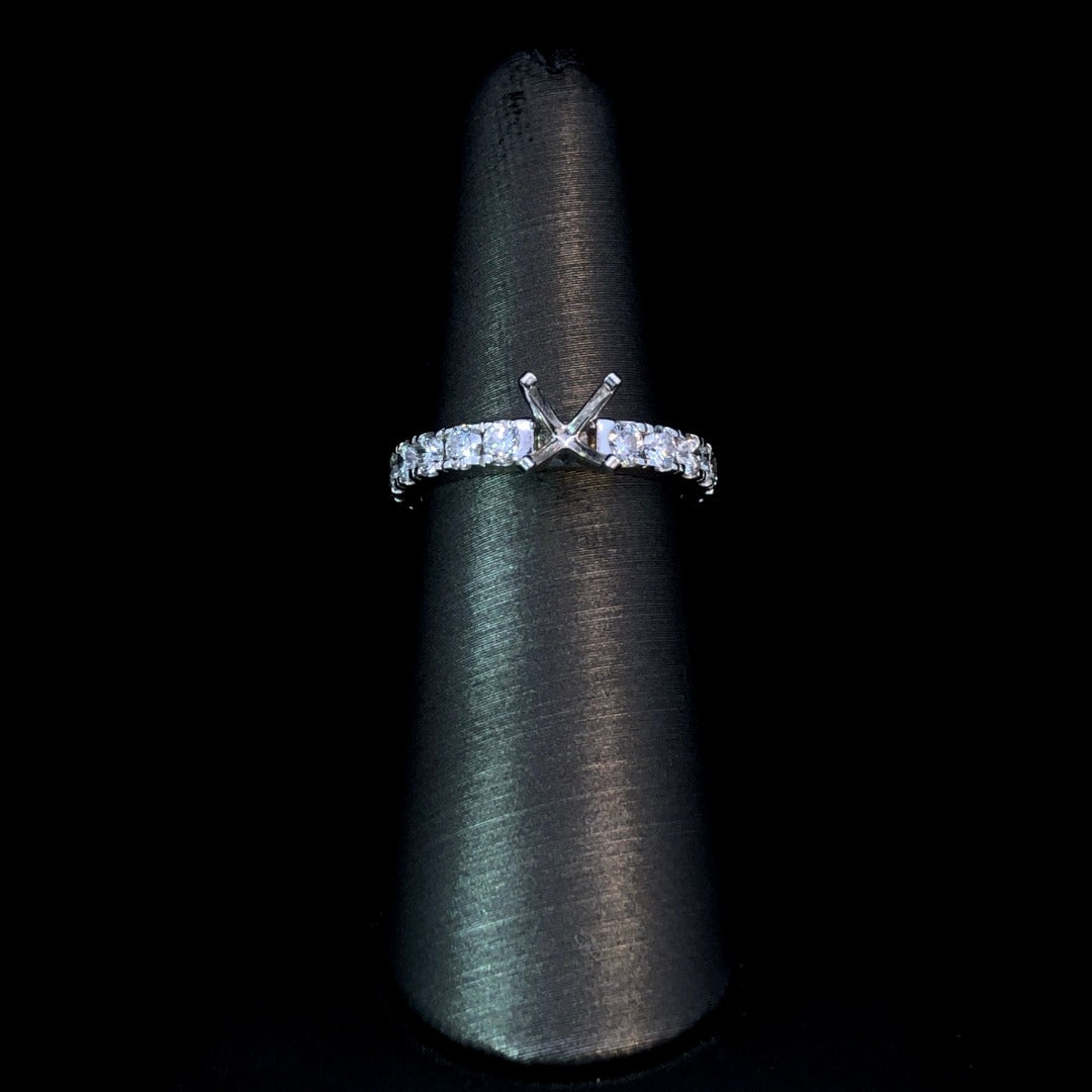 Elevate your style with our timeless diamond semi mount. Adorned with 1.14ctw of shimmering round diamonds, set in luxurious 14kt white gold. Create your own unique piece by choosing a center stone from our exquisite selection of loose stones. Make a statement with this elegant and sophisticated choice. Price is for the semi mount only. Center stone will be added at an additional cost. This ring is a size 6. If that size is not a perfect fit, first time sizing is free at the time of purchase. Additional sizing fees may apply.