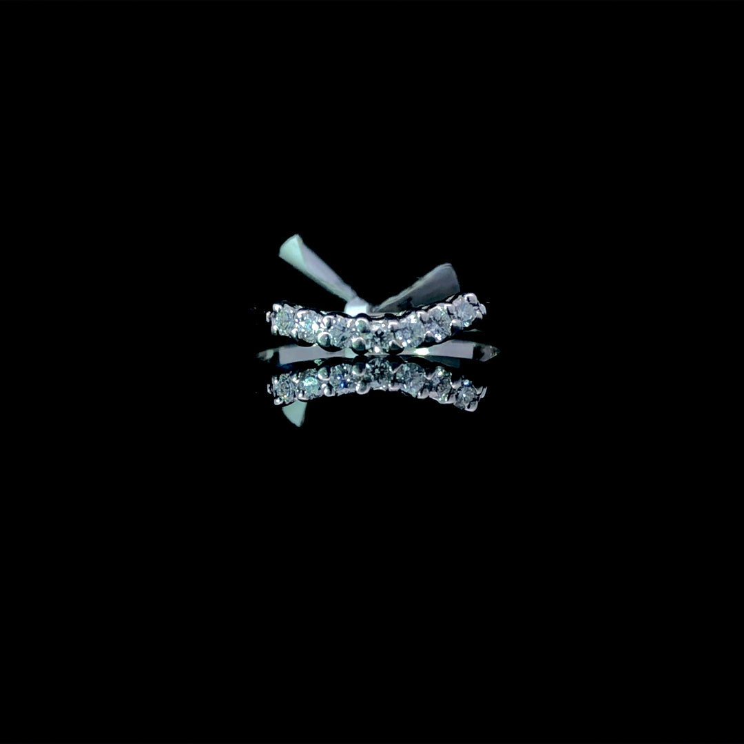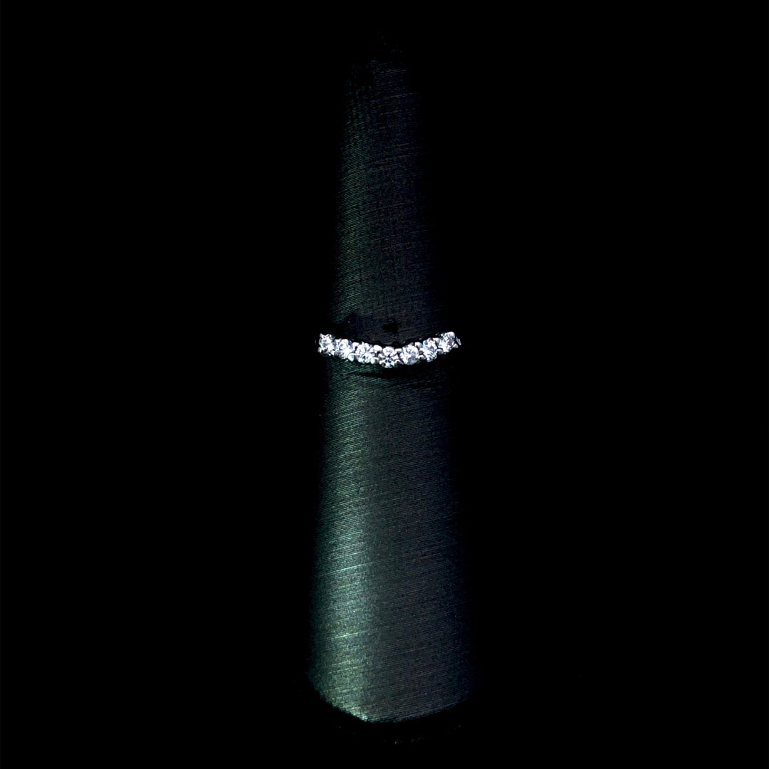 This 14kt white gold curved diamond band is elegantly adorned with .15ctw of sparkling round diamonds. The perfect accessory to add a touch of glamour to any outfit. Style meets luxury with this beautifully crafted ring. This ring is a size 6.75. If that size is not a perfect fit, first time sizing is free at the time of purchase. Additional sizing fees may apply.