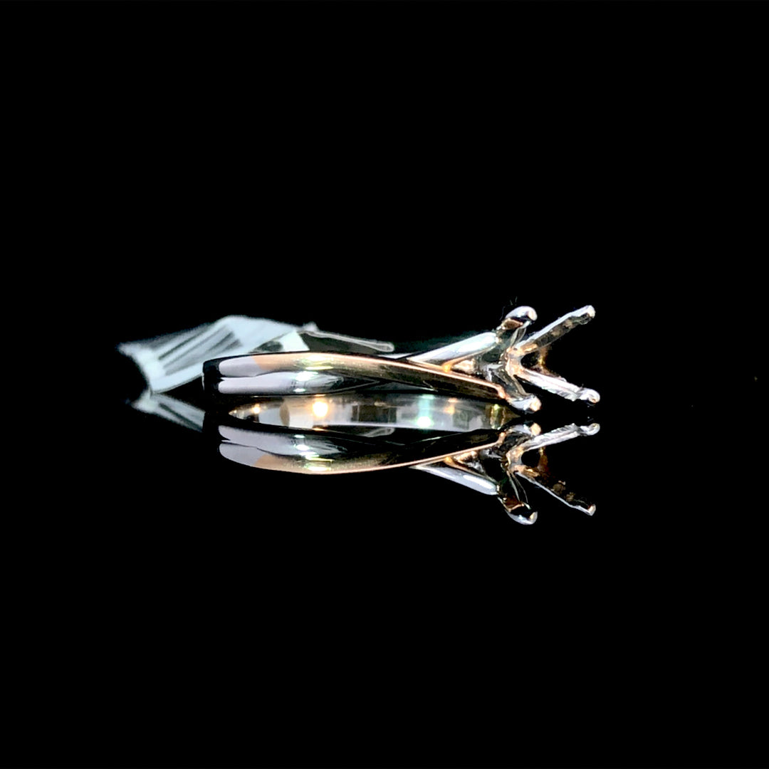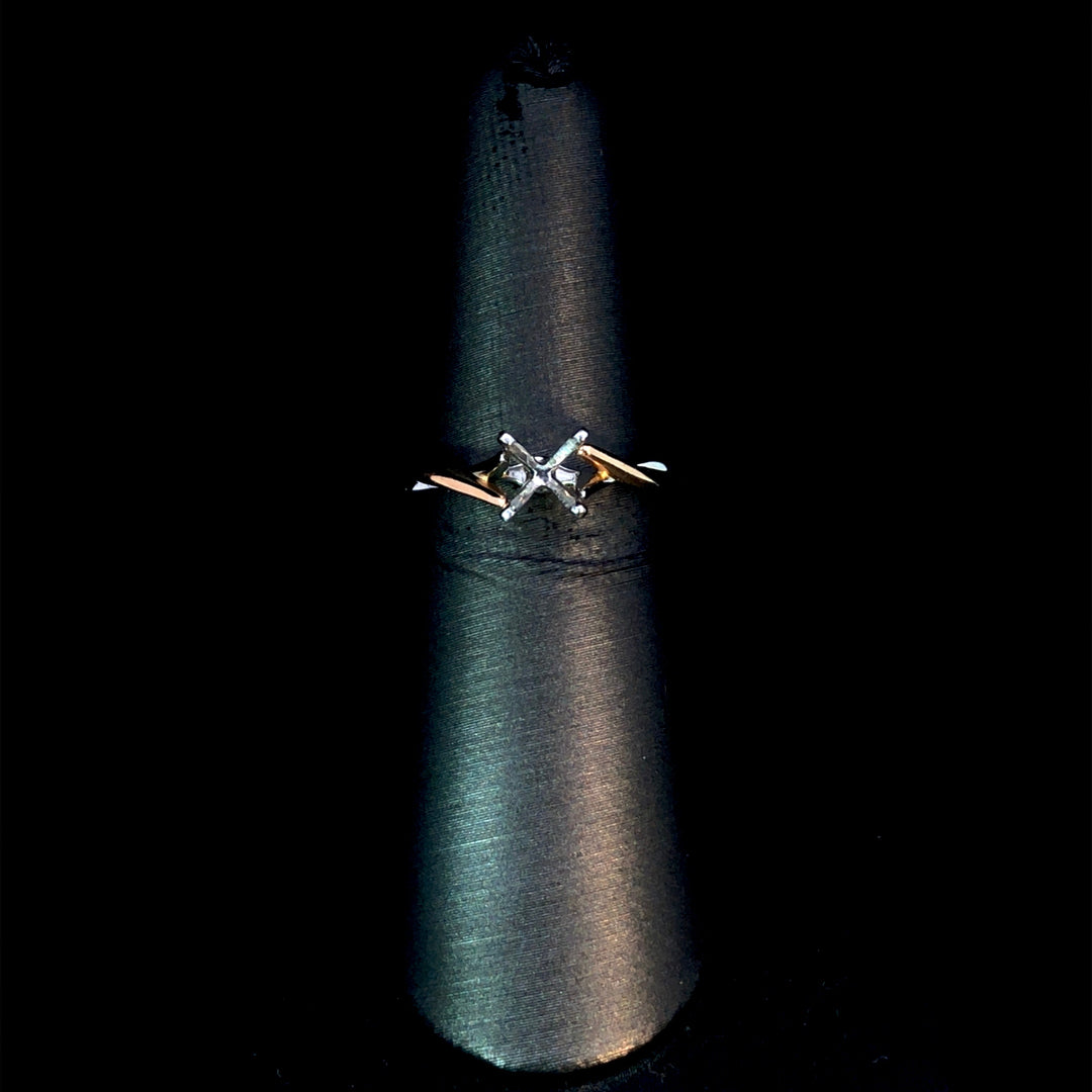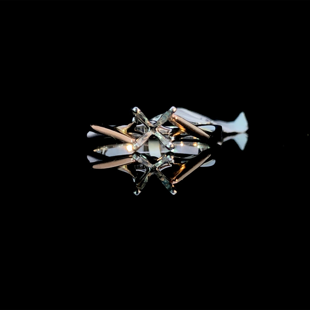 This elegant semi-mount ring showcases a graceful twist design crafted from polished 14kt white and rose gold. Its sophisticated blend of metals offers timeless appeal, while allowing you to personalize the piece by selecting your ideal center stone from our extensive loose stone collection, creating a truly unique and meaningful ring. Price is for the semi mount only. Center stone will be added at an additional cost. This ring is a size 6. If that size is not a perfect fit, it can be sized up 2 sizes for free at the time of purchase. Additional sizing fees may apply.
