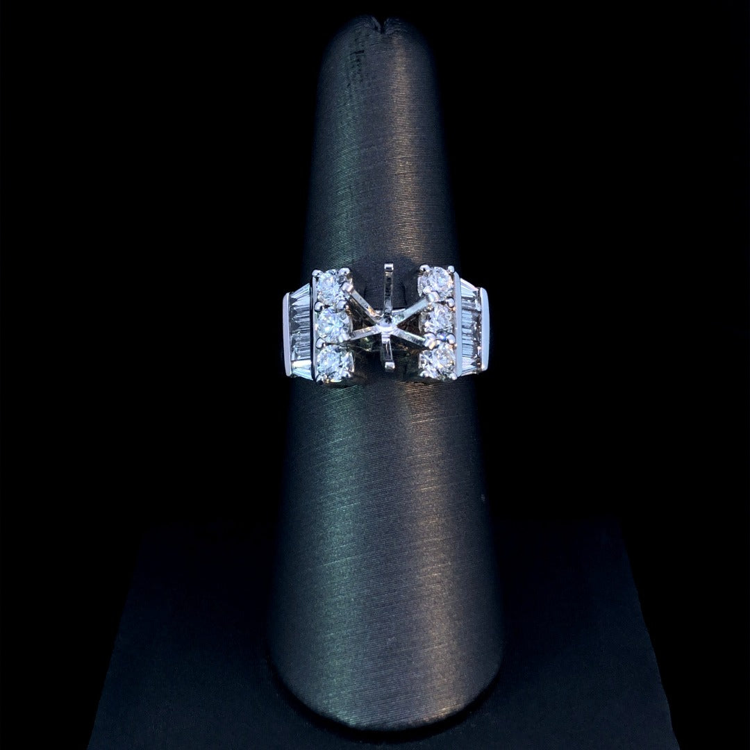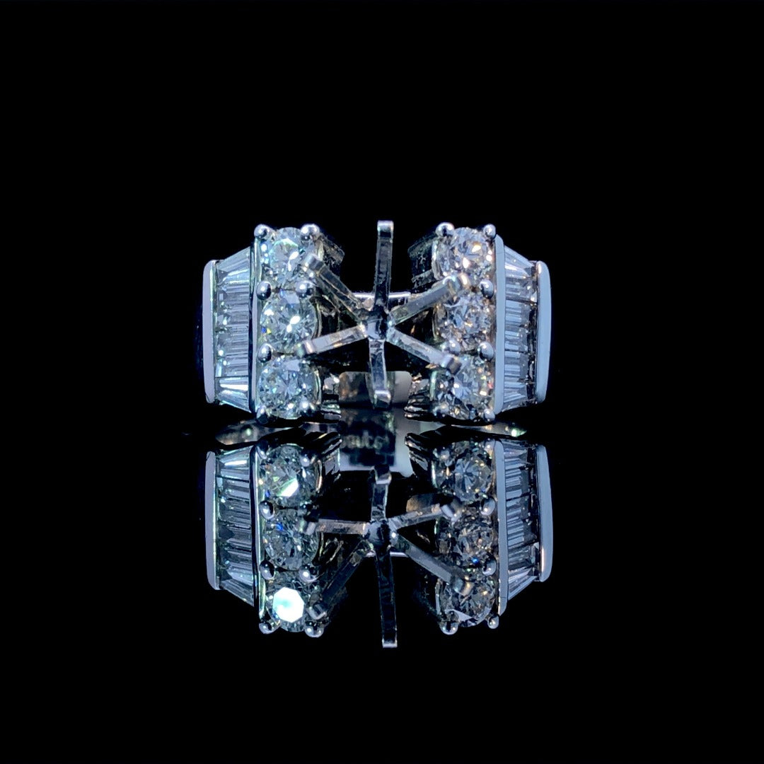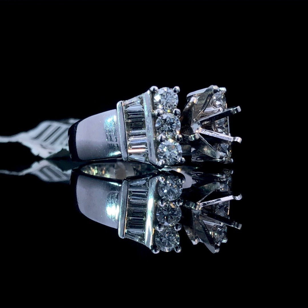 Experience true luxury with this gorgeous diamond semi mount. Featuring 1.40ctw of round and baguette diamonds set in 14kt white gold, this stunning piece allows you to create a unique and personalized statement piece with your choice of center stone from our vast selection. Elevate your style and make a lasting impression. Price is for the semi mount only. Center stone will be added at an additional cost. This ring is a size 7. If that size is not a perfect fit, first time sizing is free at the time of purchase. Additional sizing fees may apply.