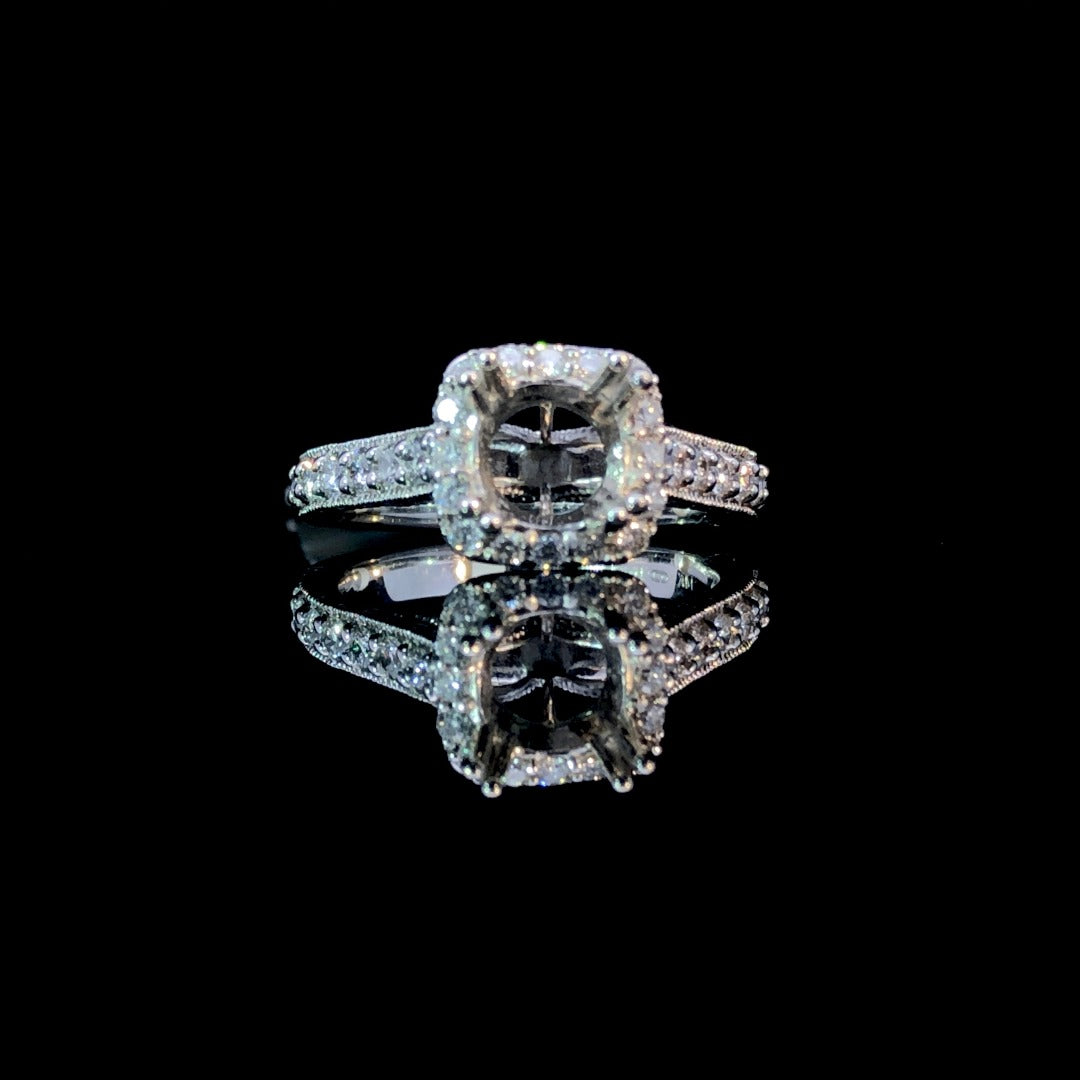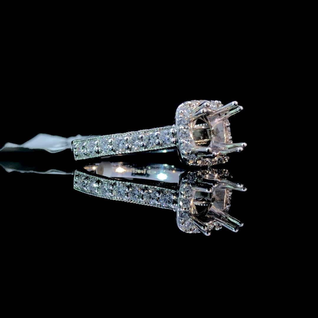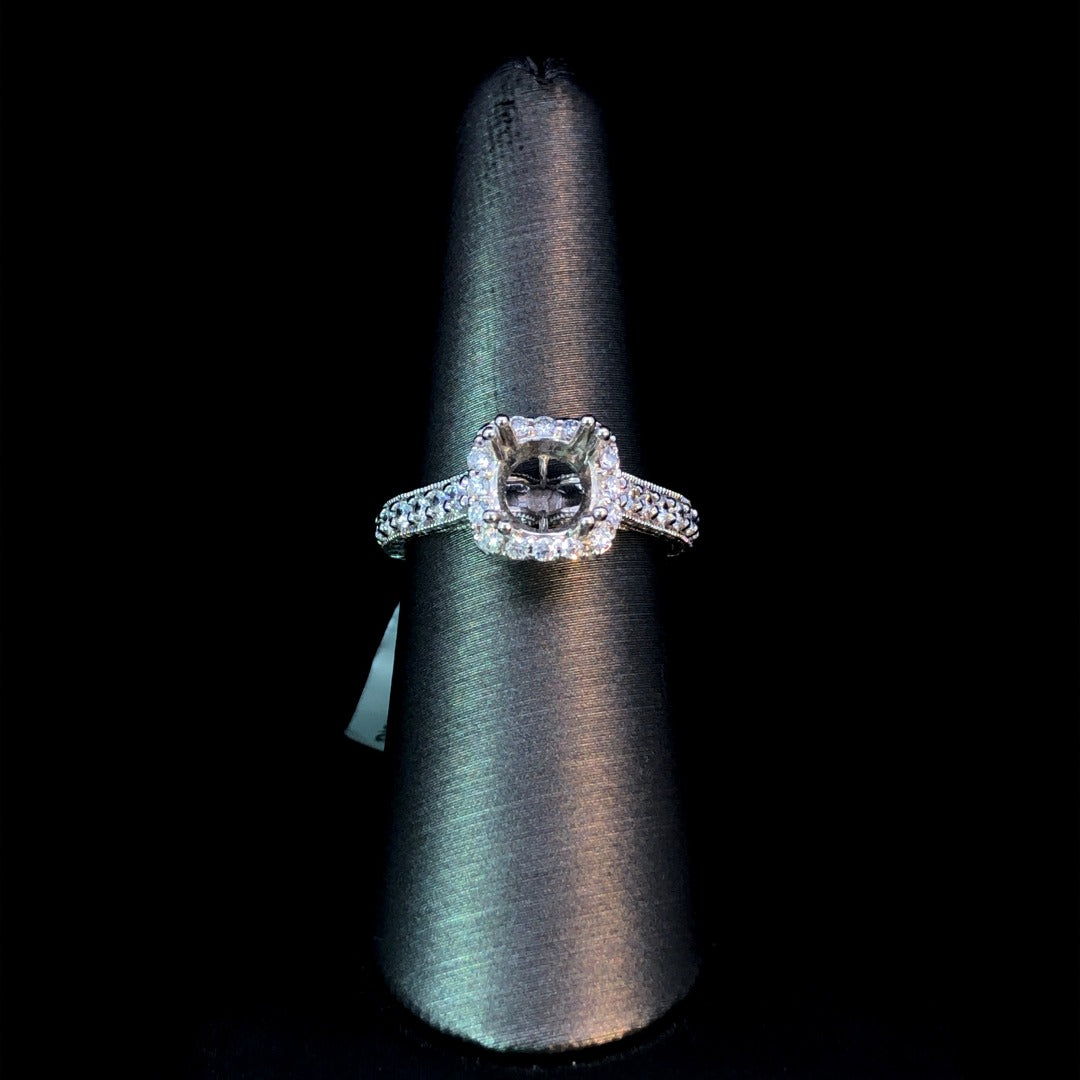 Make a statement with our stunning diamond semi mount. With .66ctw of round diamonds and elegant milgrain detailing, this 14kt white gold piece will elevate any center stone you choose from our selection. Indulge in luxury and complete your look with this gorgeous halo design. Price is for the semi mount only. Center stone will be added at an additional cost. This ring is a size 7. If that size is not a perfect fit, first time sizing is free at the time of purchase. Additional sizing fees may apply.