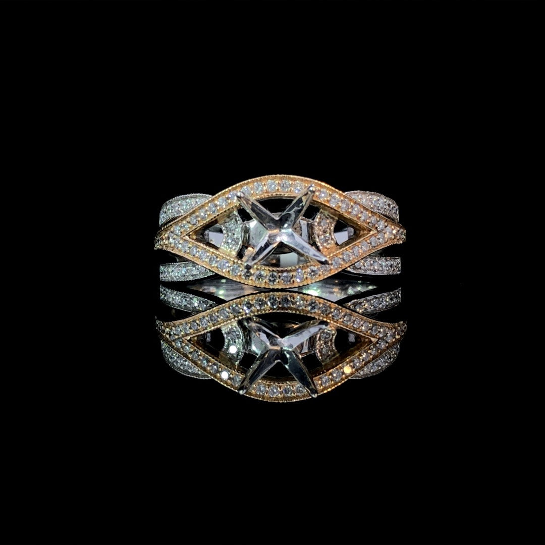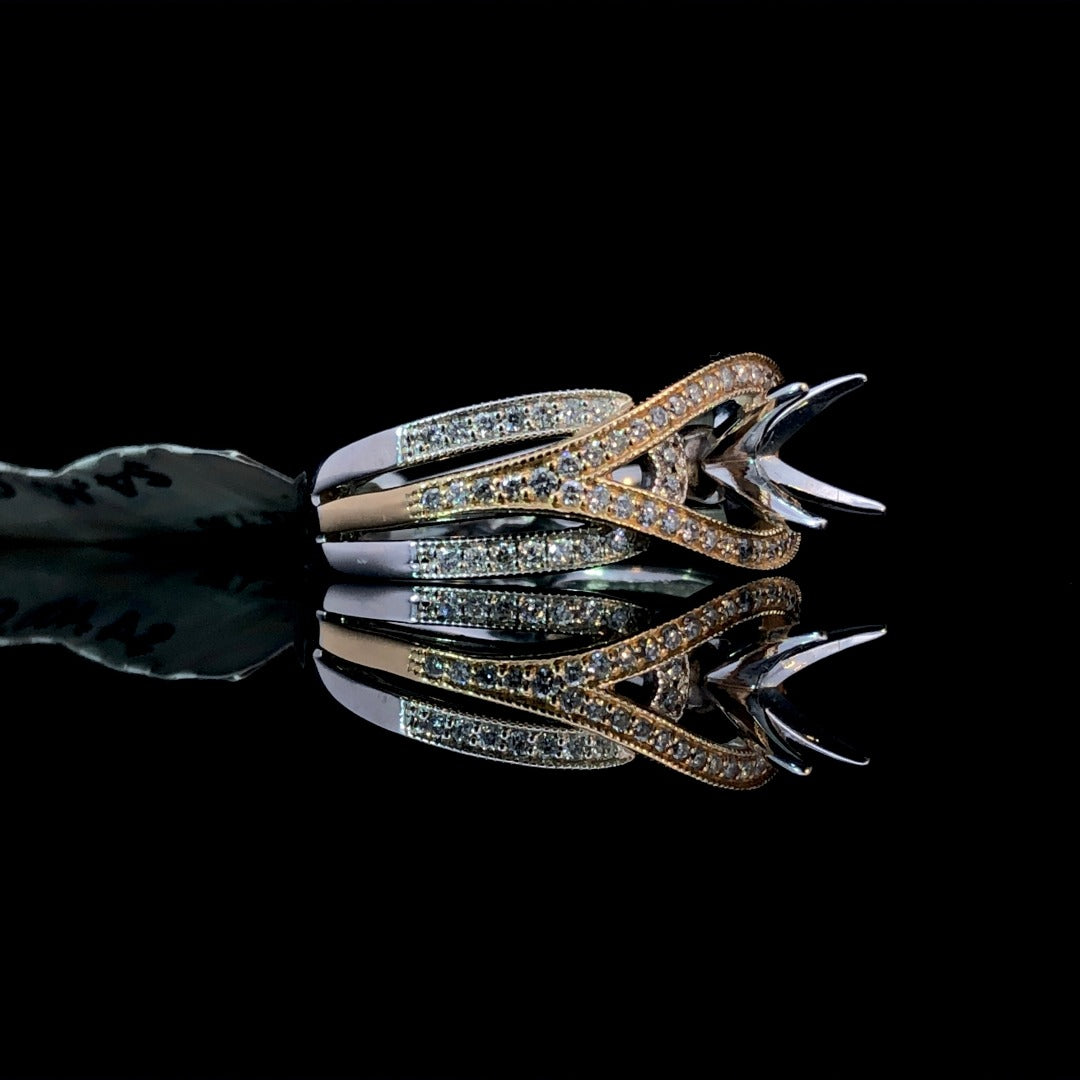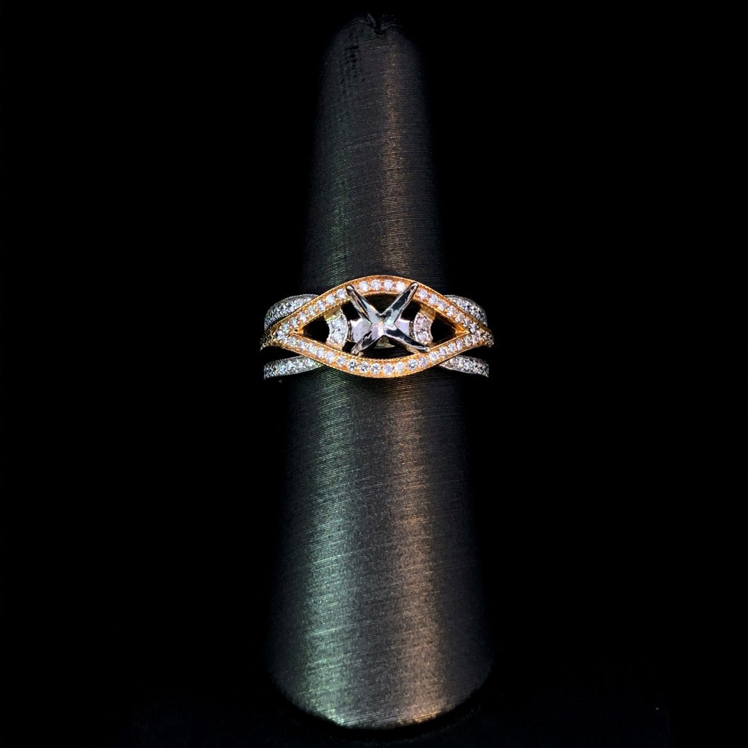 Indulge in luxury with our stunning diamond semi mount. Featuring an intricate 2-tone gold design intertwined with sparkling .42ctw round diamonds. Customize with your choice of center stone from our wide selection for a truly gorgeous and one-of-a-kind ring. Elevate your style with this exquisite piece. Price is for the semi mount only. Center stone will be added at an additional cost. This ring is a size 7. If that size is not a perfect fit, first time sizing is free at the time of purchase. Additional sizing fees may apply.
