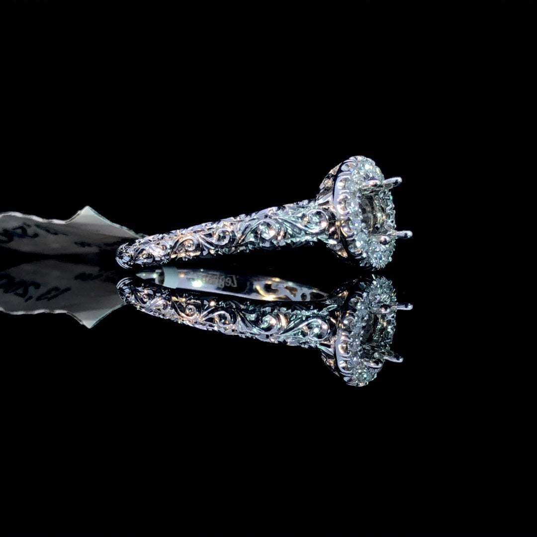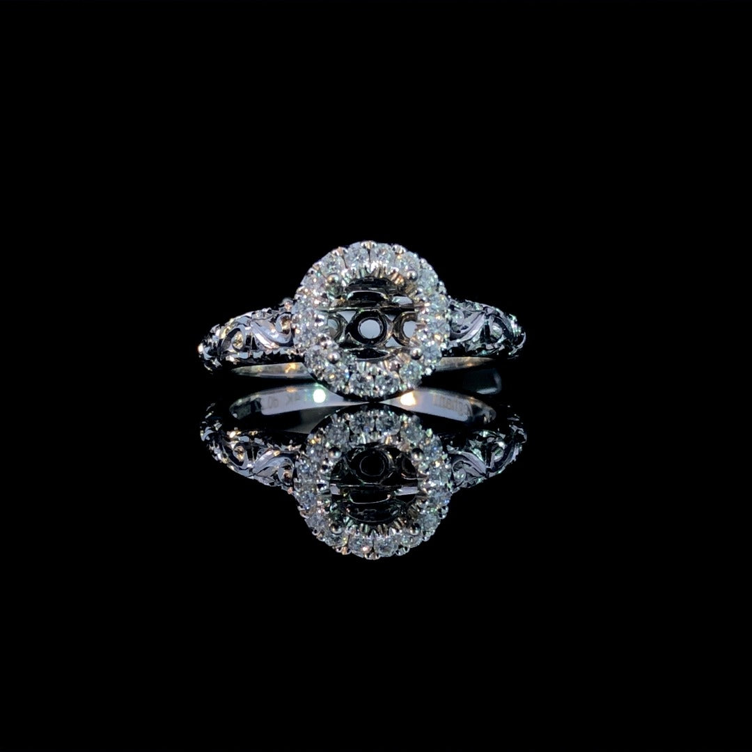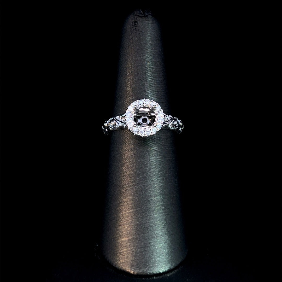 Elevate your style with this diamond semi mount, featuring a sparkling round diamond halo and an intricately detailed 14kt white gold band. The .22ctw of round diamonds add a touch of brilliance. Choose from our unbeatable selection of loose stones to complete this stunning piece. Price is for the semi mount only. Center stone will be added at an additional cost. This ring is a size 6.5. If that size is not a perfect fit, first time sizing is free at the time of purchase. Additional sizing fees may apply.