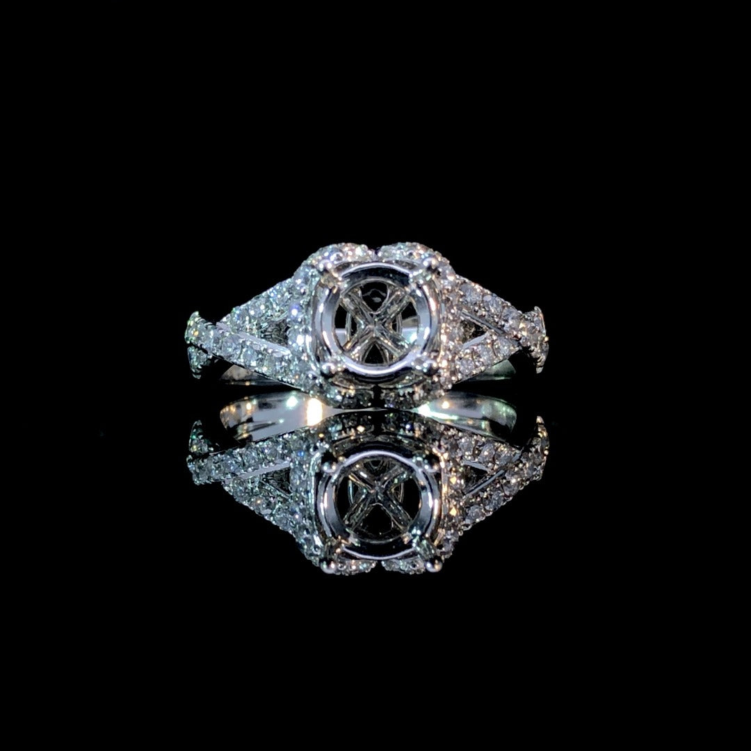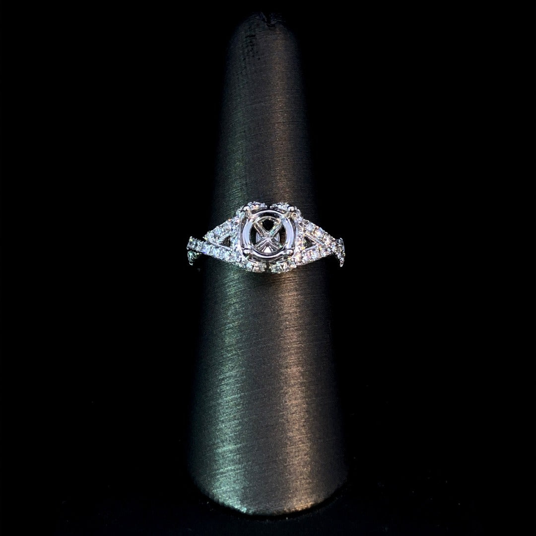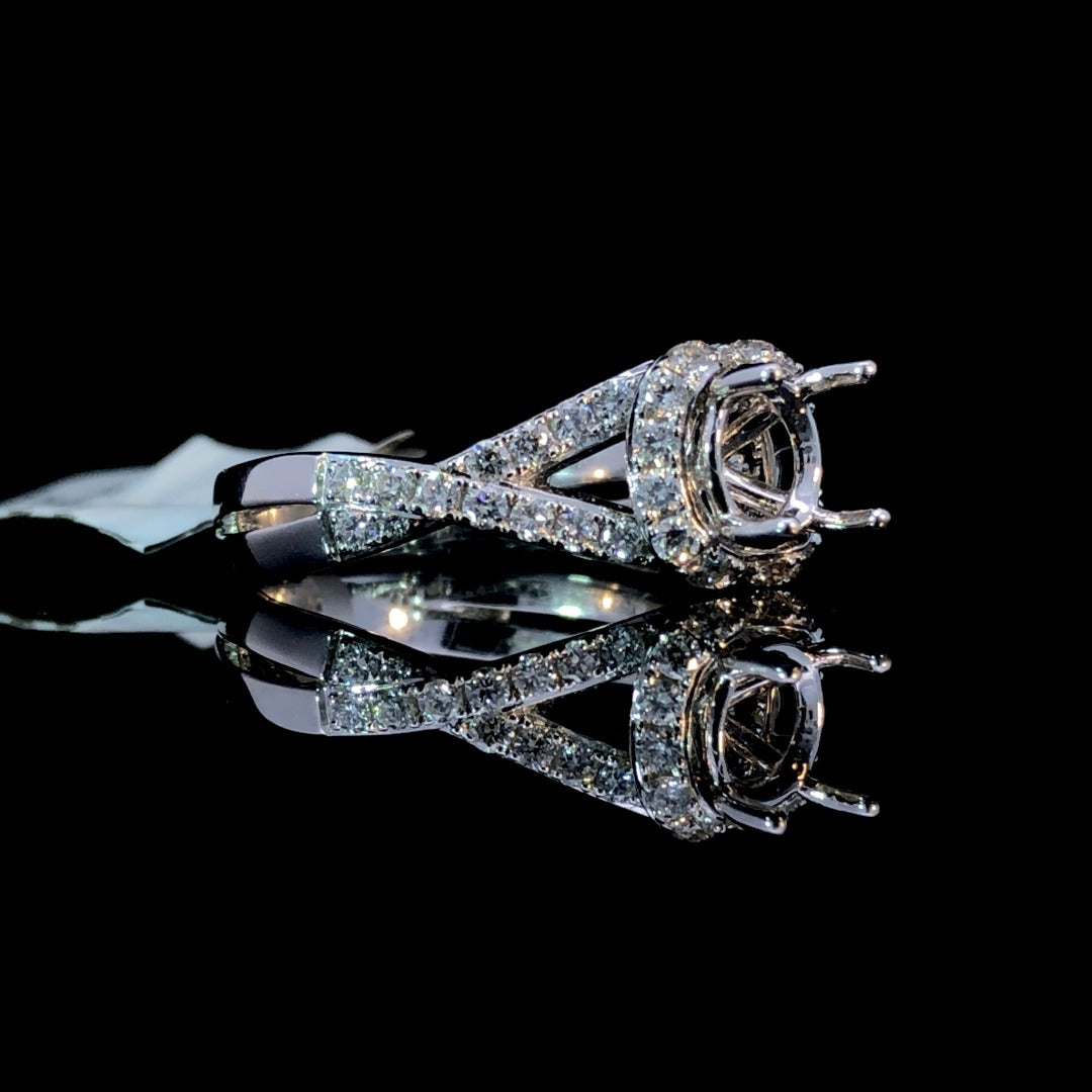 Fall in love with our stunning diamond semi mount! The 14kt white gold split shank and halo design, adorned with .65ctw of round diamonds, will add a touch of elegance to any center stone you choose from our wide selection. Dare to be unique and make this your perfect piece! Price is for the semi mount only. Center stone will be added at an additional cost. This ring is a size 7. If that size is not a perfect fit, first time sizing is free at the time of purchase. Additional sizing fees may apply.
