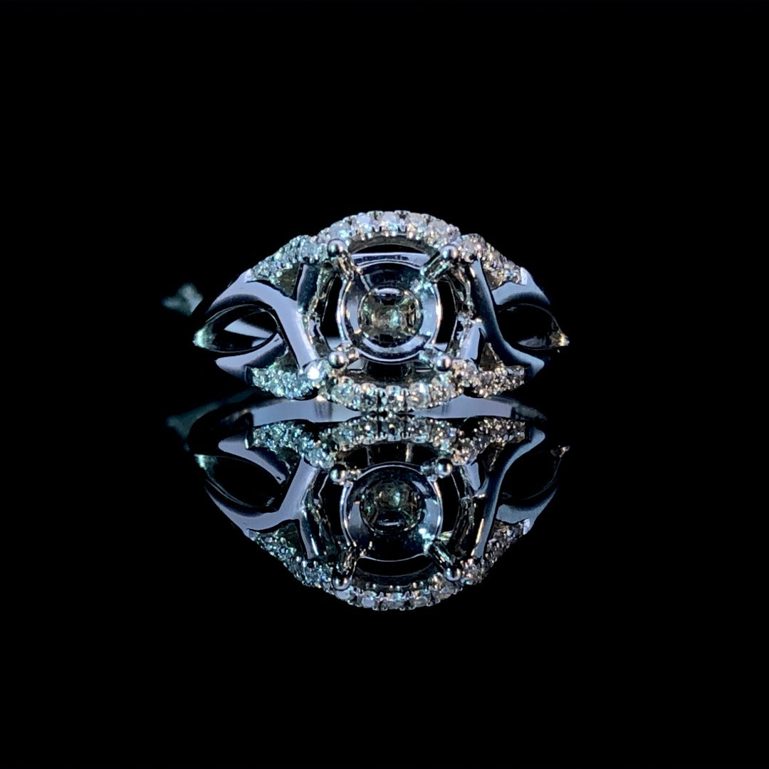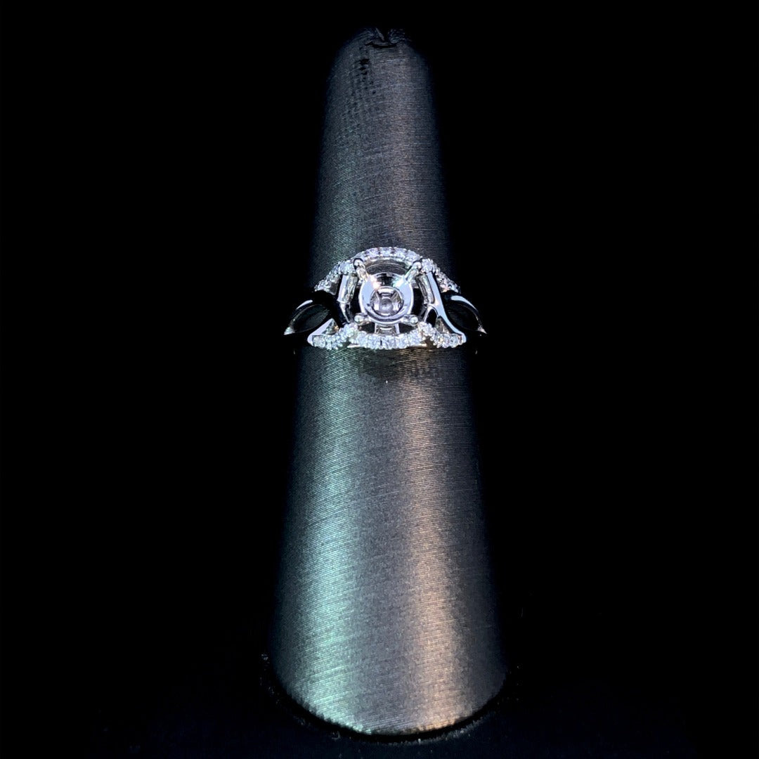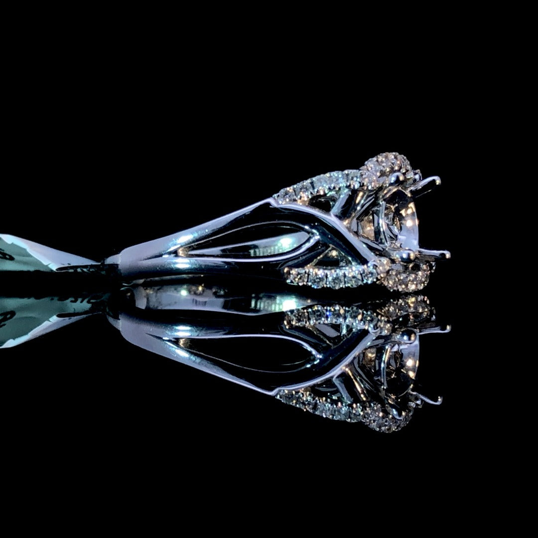 Enhance your beauty with our luxurious diamond semi mount. Choose from our premium loose stone selection for the center stone and witness the elegance of .16ctw of round diamonds swirling in smooth 14kt white gold. Bring unmatched sparkle to your look with this exclusive piece. Price is for the semi mount only. Center stone will be added at an additional cost. This ring is a size 6.5. If that size is not a perfect fit, first time sizing is free at the time of purchase. Additional sizing fees may apply.