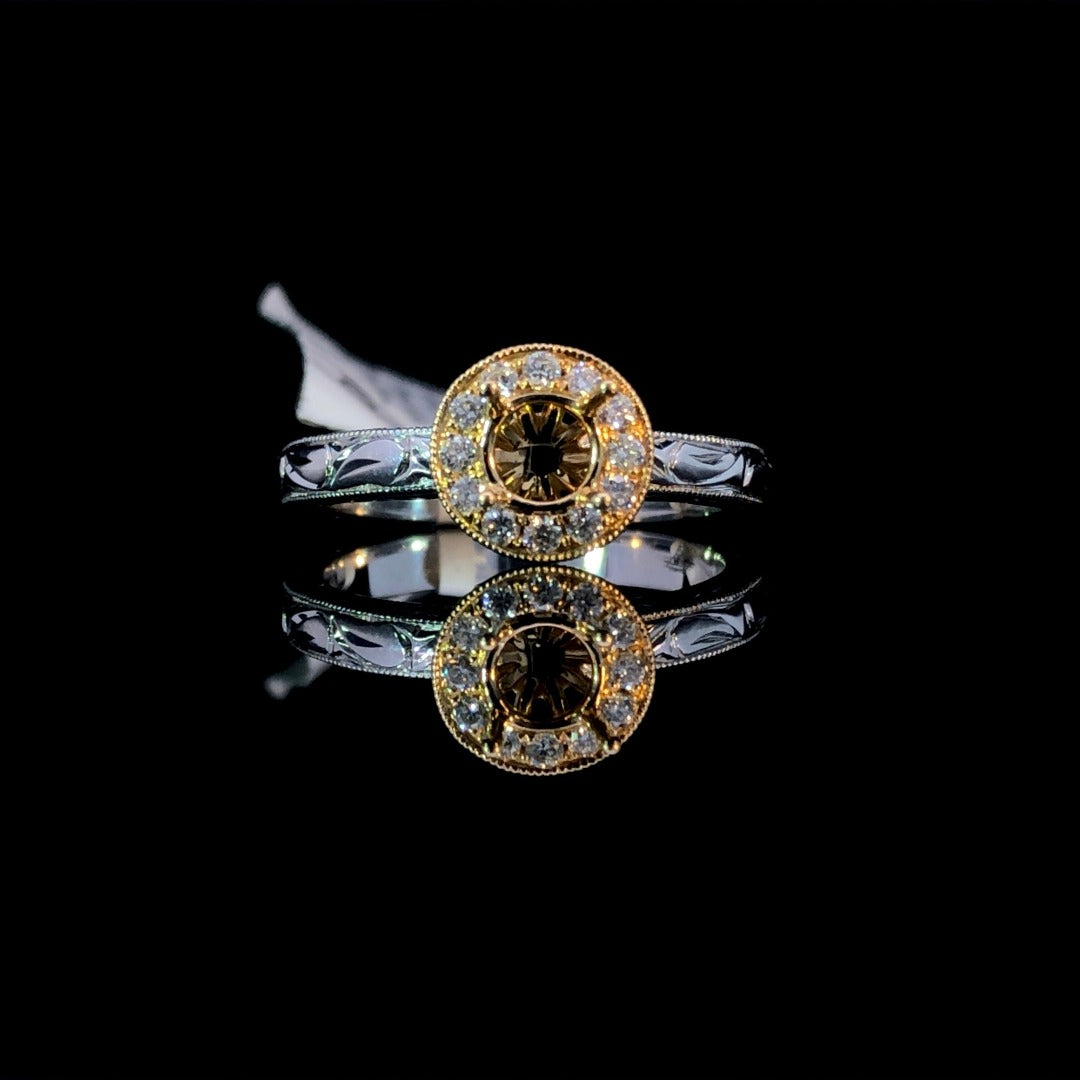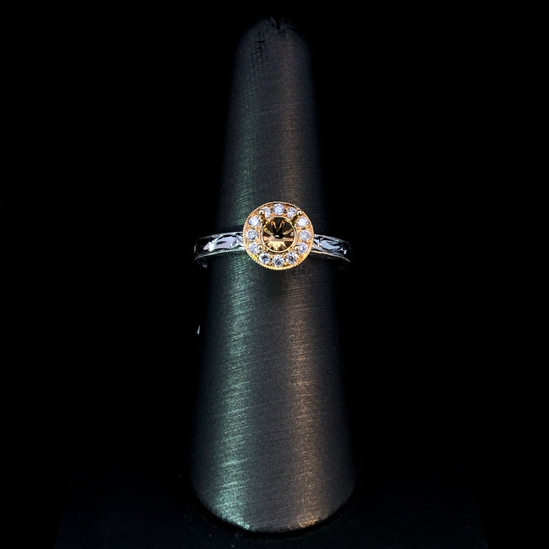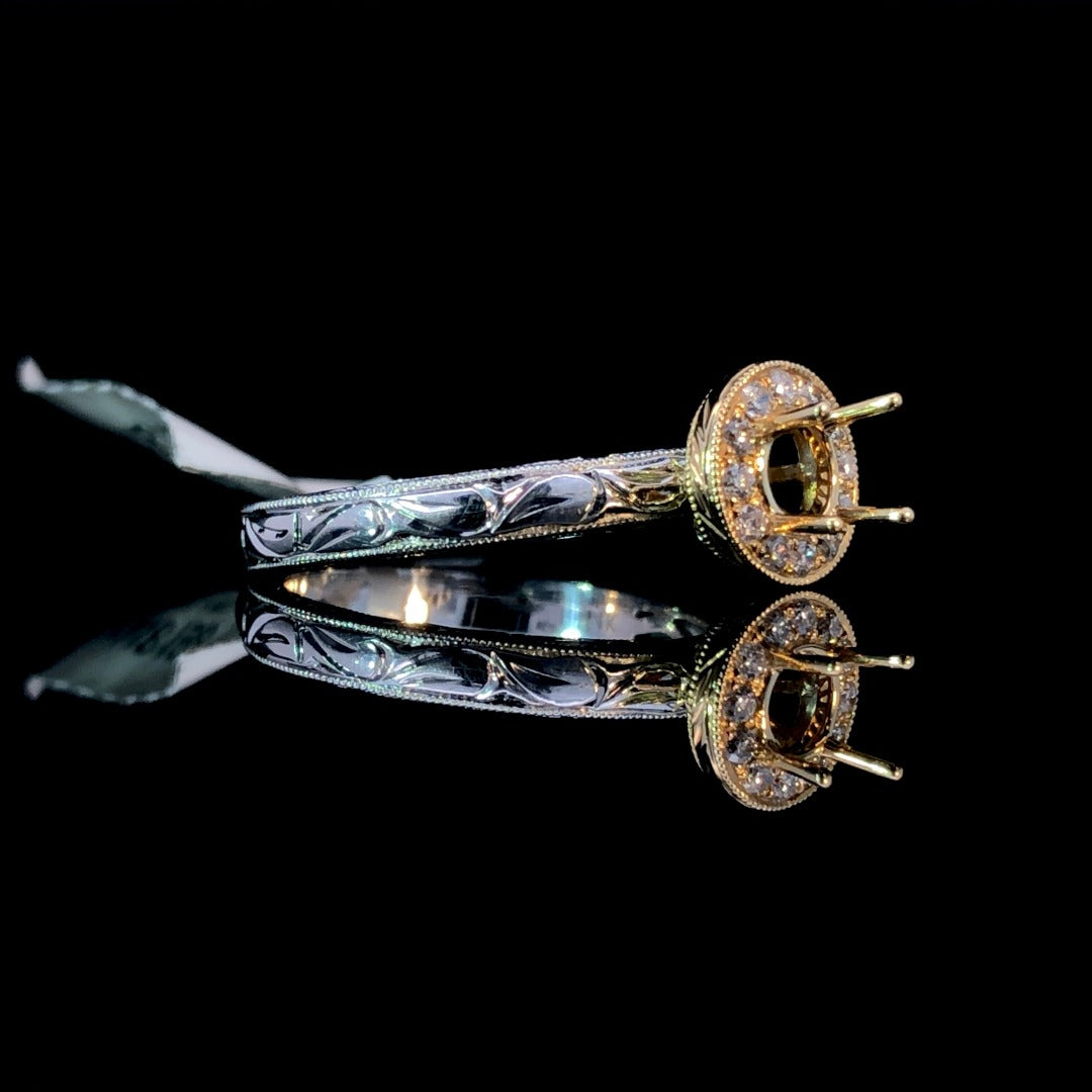 Indulge in luxury with our stunning diamond semi mount. The round yellow gold halo, adorned with .14ctw of round diamonds, exudes sophistication. The 14kt white gold band features intricate etching for added detail. Customize this 2-tone piece with your choice of center stone from our exquisite selection. Price is for the semi mount only. Center stone will be added at an additional cost. This ring is a size 7. If that size is not a perfect fit, first time sizing is free at the time of purchase. Additional sizing fees may apply.